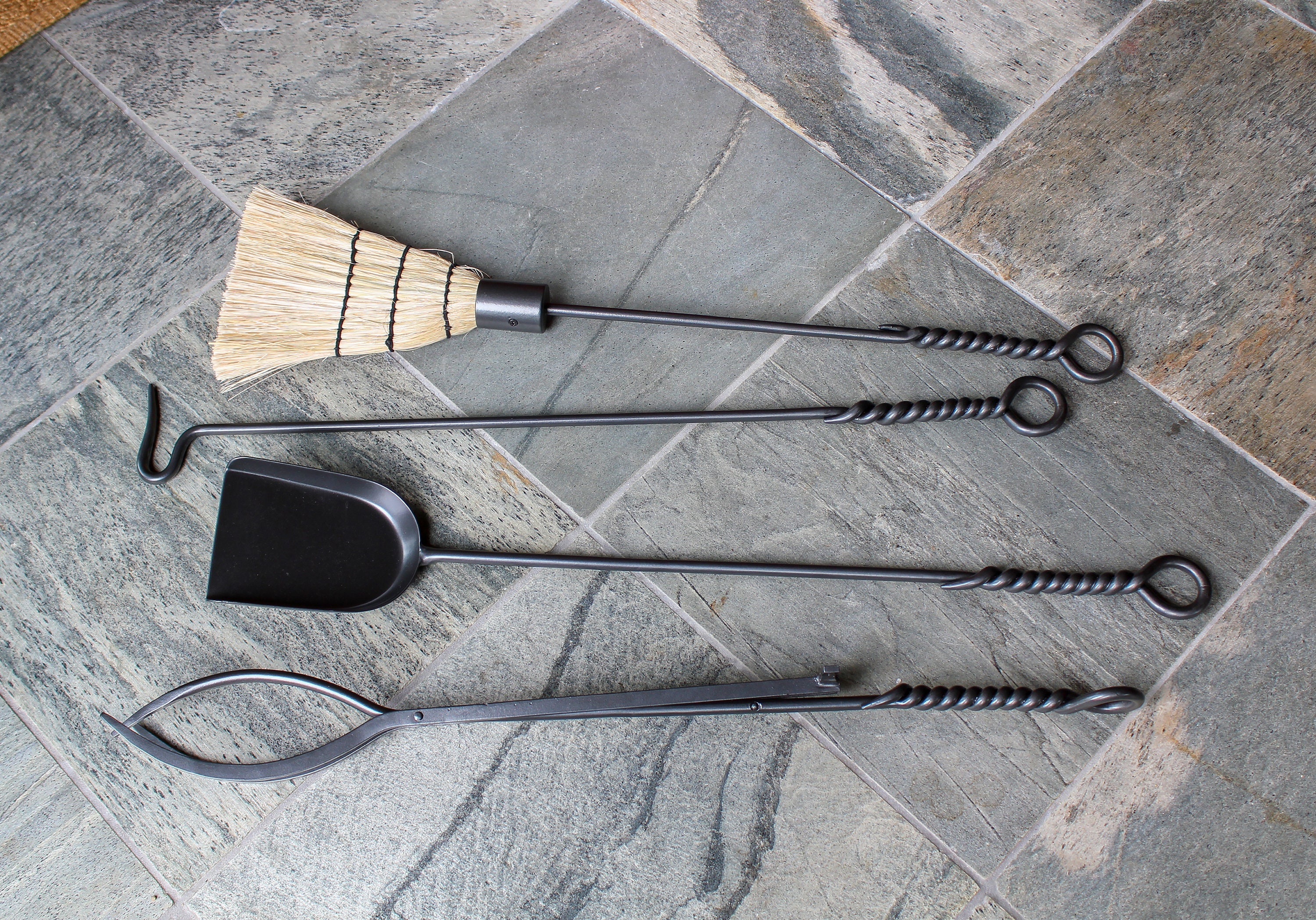 This fireplace tool set has traditional twisted and looped handles. Four tools are included- fireplace poker, three-point tongs, ash shovel, and natural sorghum fiber brush, that hang from the stand. Made of forged wrought iron, the set is finished in a Graphite powder coating for durability with a natural iron look. No stand is included with these tools