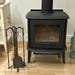 This forged wrought iron toolset is made from solid square stock and features the traditional Shepherd’s Hook handle style. The four tools – fireplace poker, hoe, ash shovel, and natural fiber sorghum brush hang on a footed stand. This 22" tall set is perfect for a small Victorian fireplace or wood stove.
