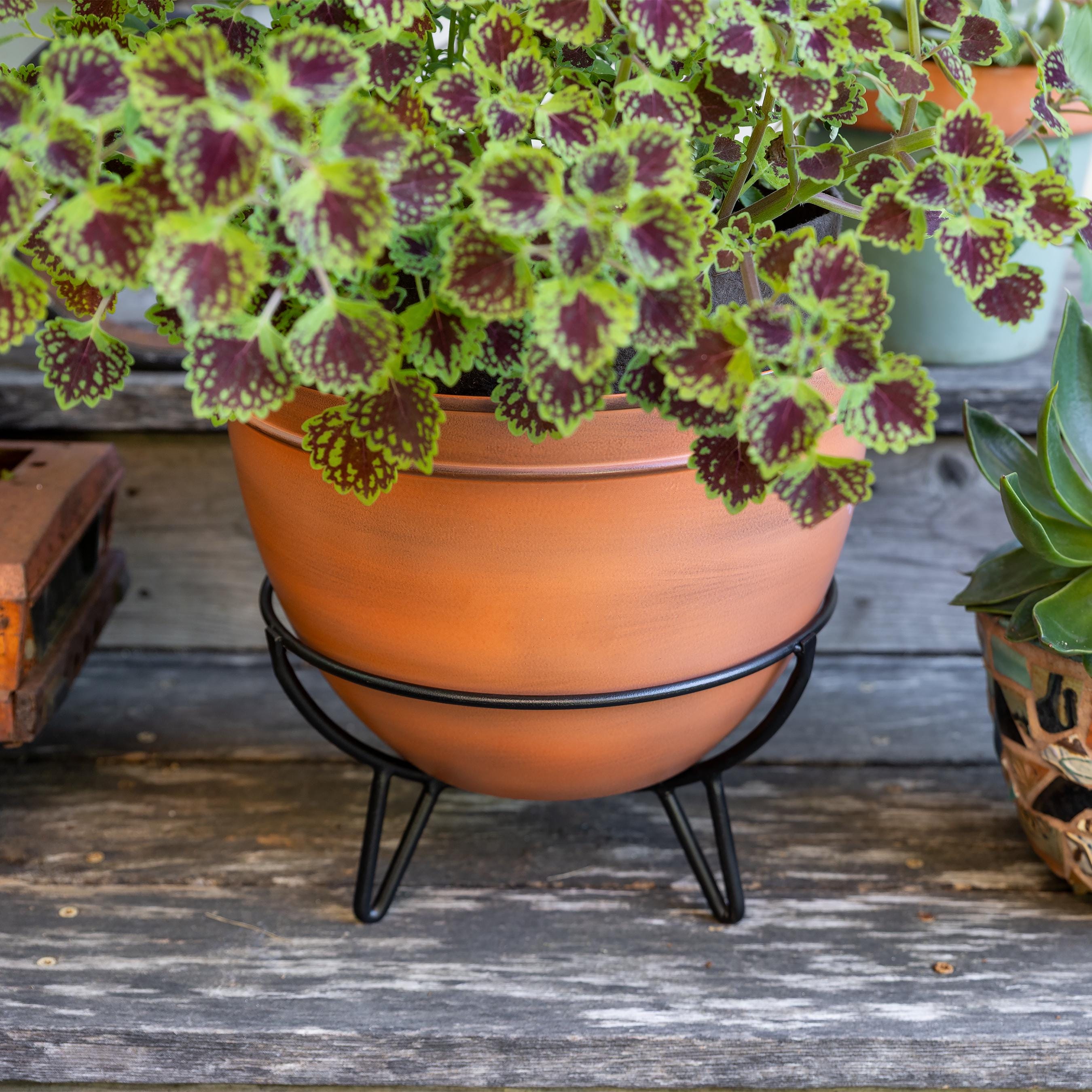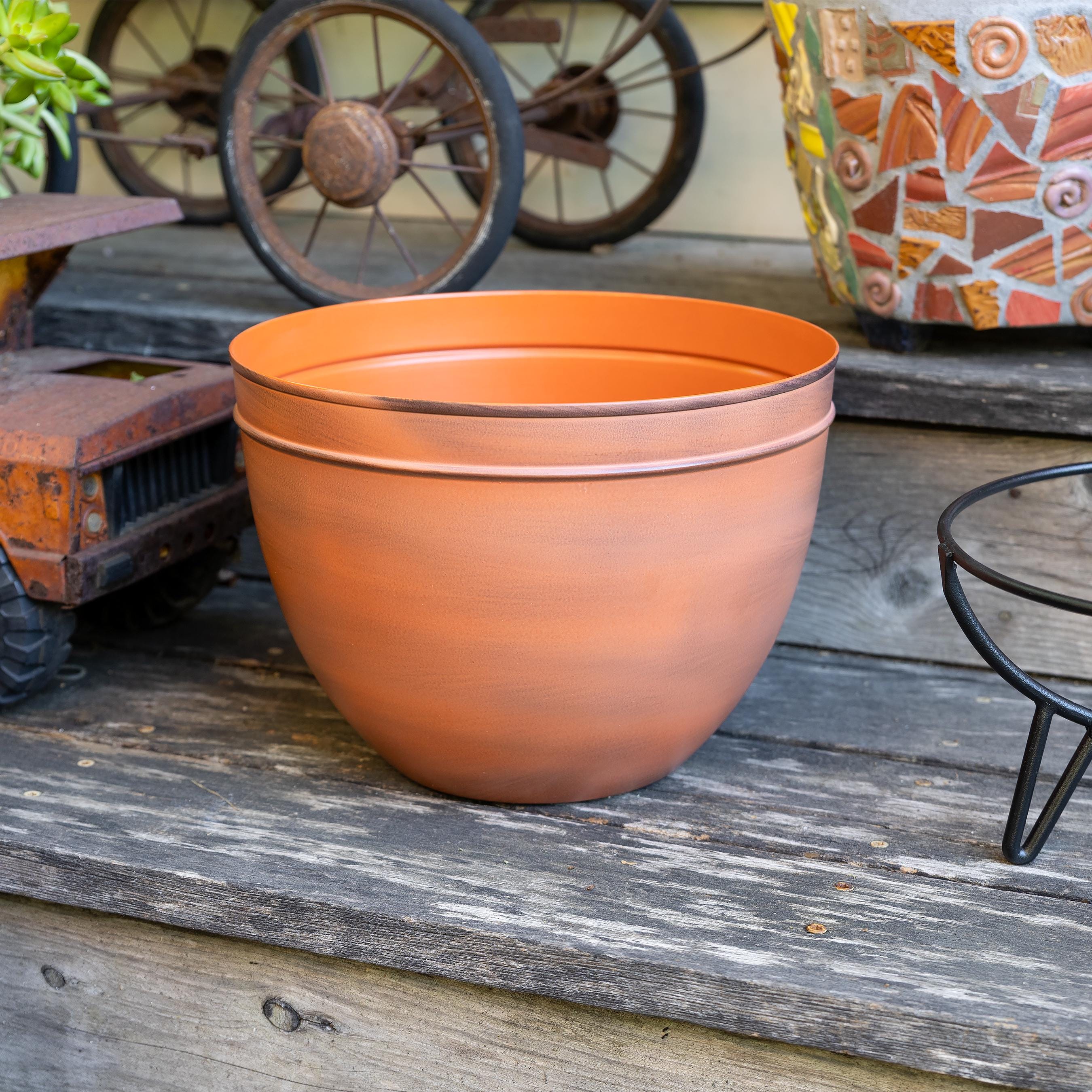 This planting bowl has a simple minimalist design to show off cascading annuals or houseplants. Lightweight and finished with a Burnt Sierra patina, use the bowl to hold one or more liner pots or direct plant, removing the rubber stopper provided in the base for proper drainage.