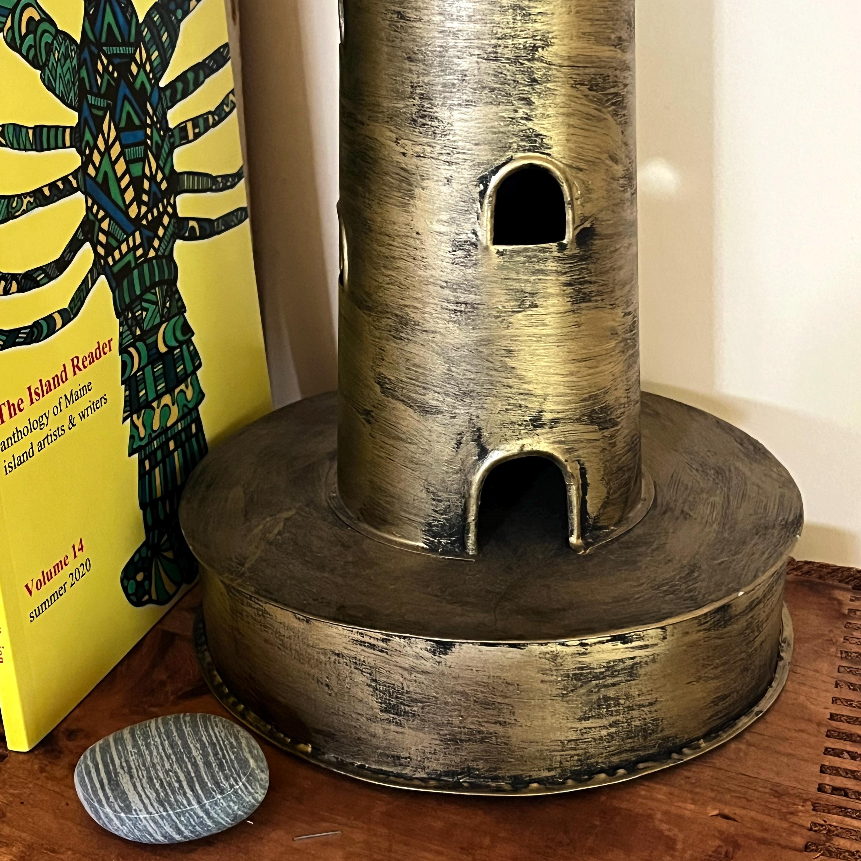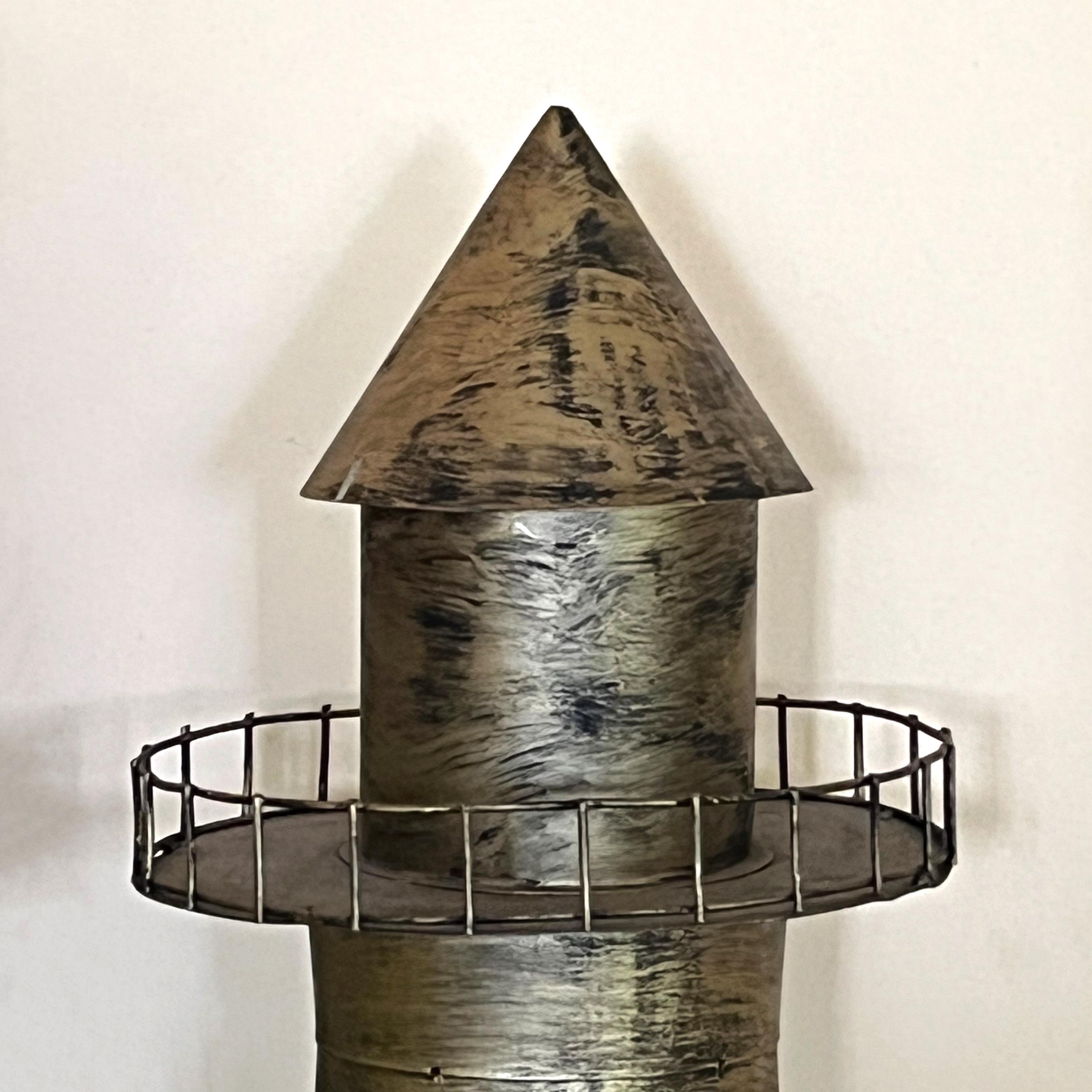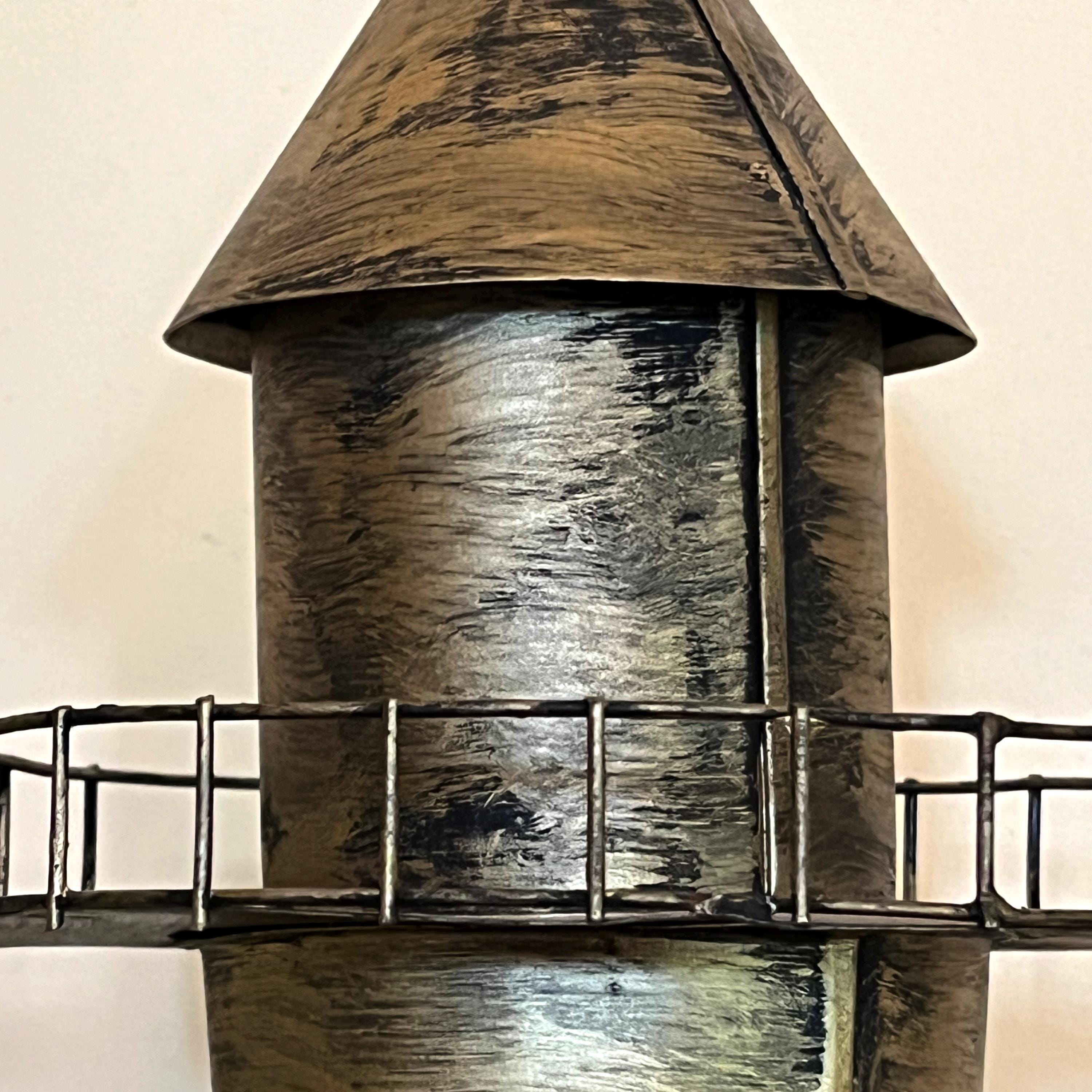 Made of galvanized sheet metal with a rustic antiqued finish, this hand-crafted lighthouse is a nice addition to a seaside decor. Made from soldered sheet metal and wire, this item is from our archive of samples and shows no signs of wear or use.