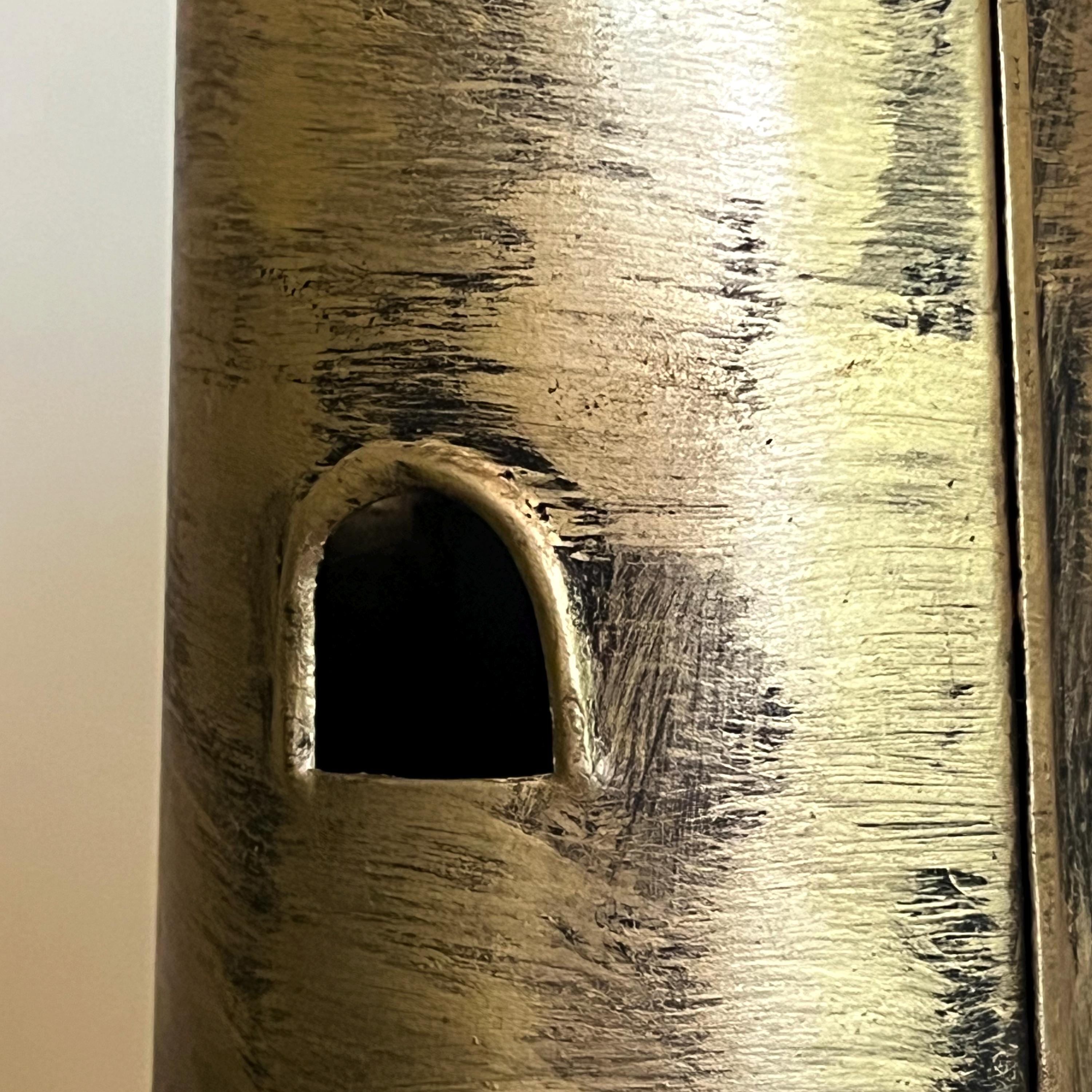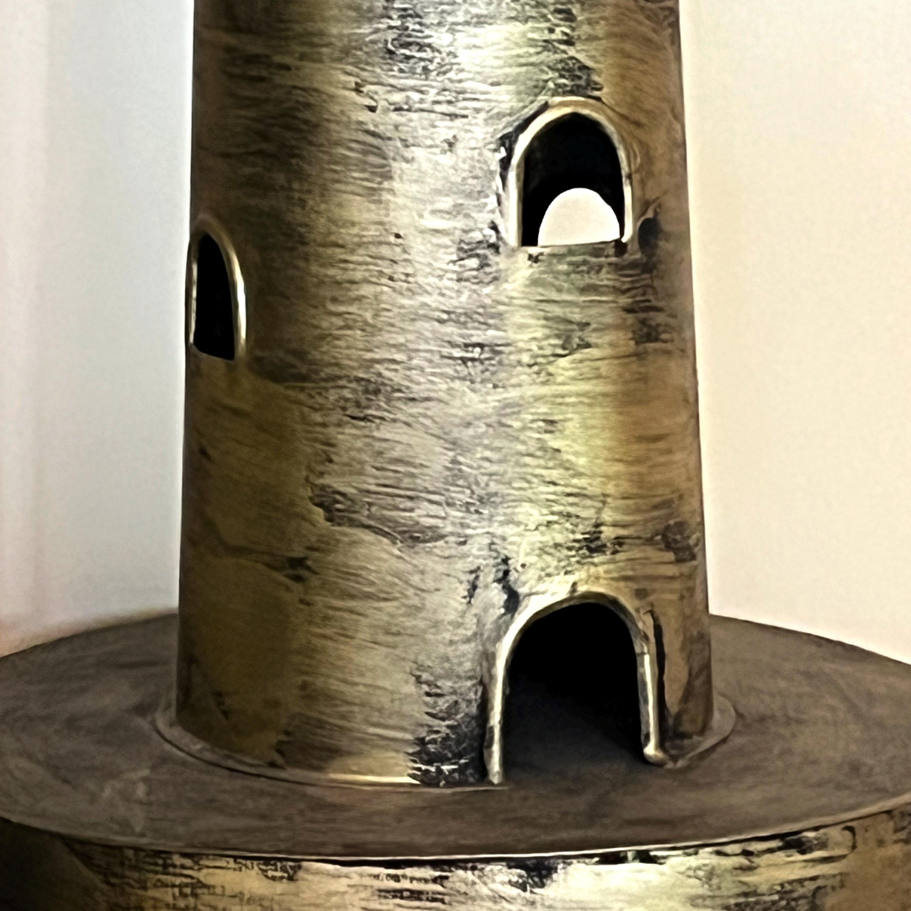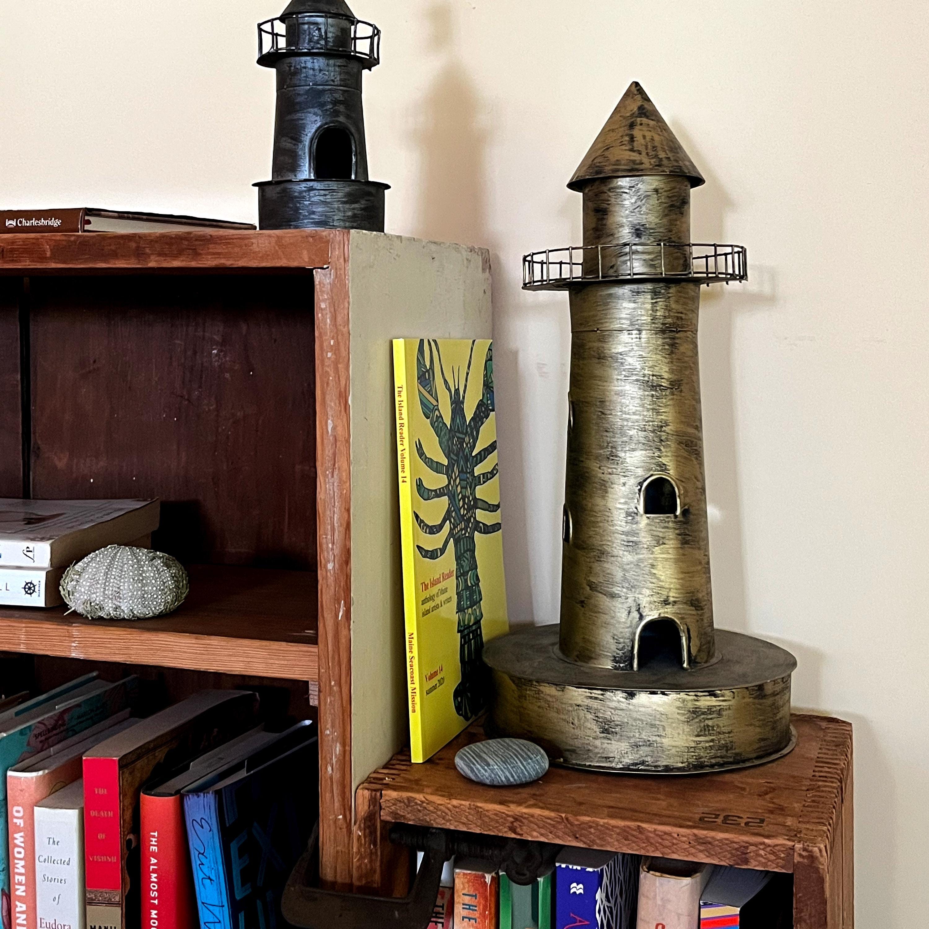 Made of galvanized sheet metal with a rustic antiqued finish, this hand-crafted lighthouse is a nice addition to a seaside decor. Made from soldered sheet metal and wire, this item is from our archive of samples and shows no signs of wear or use.