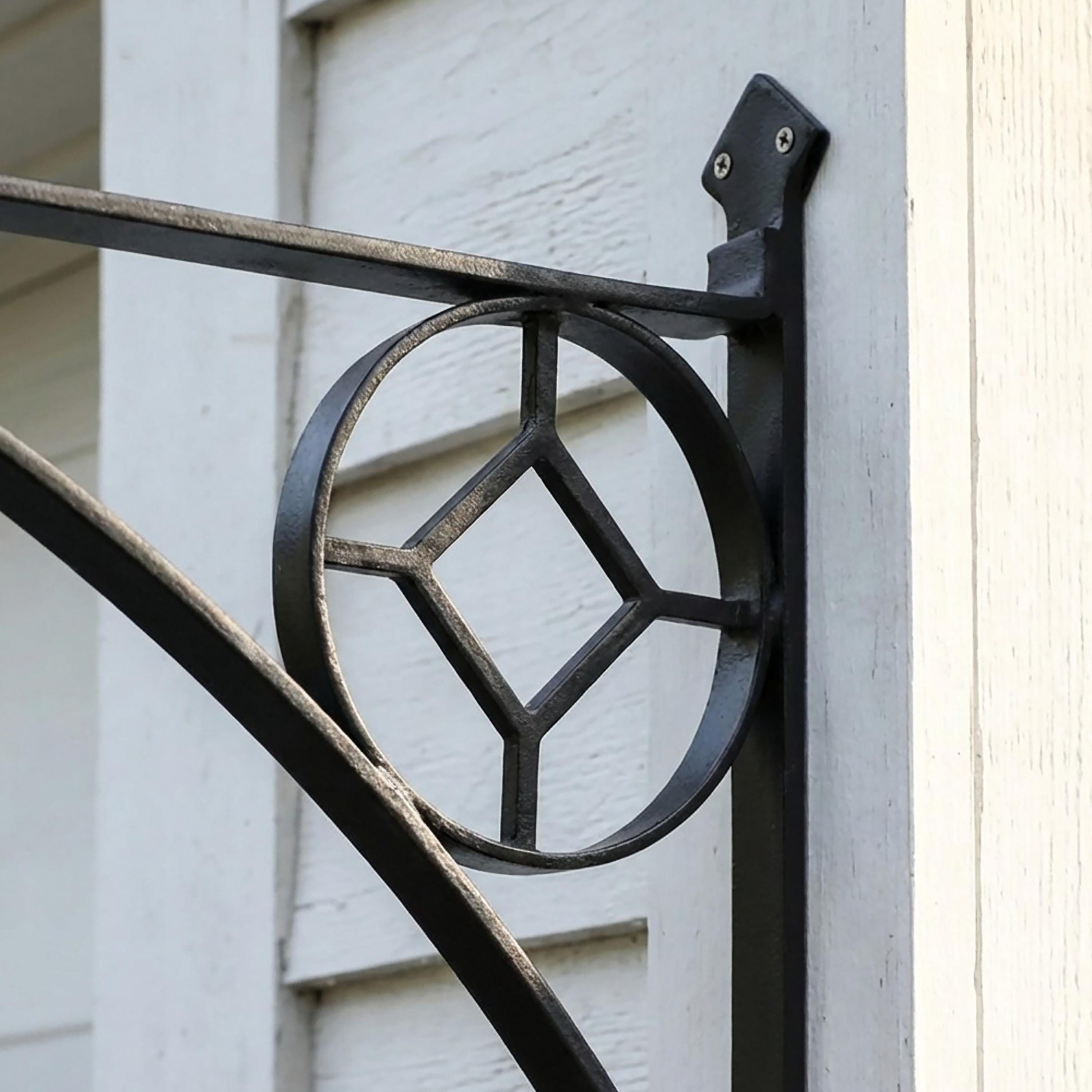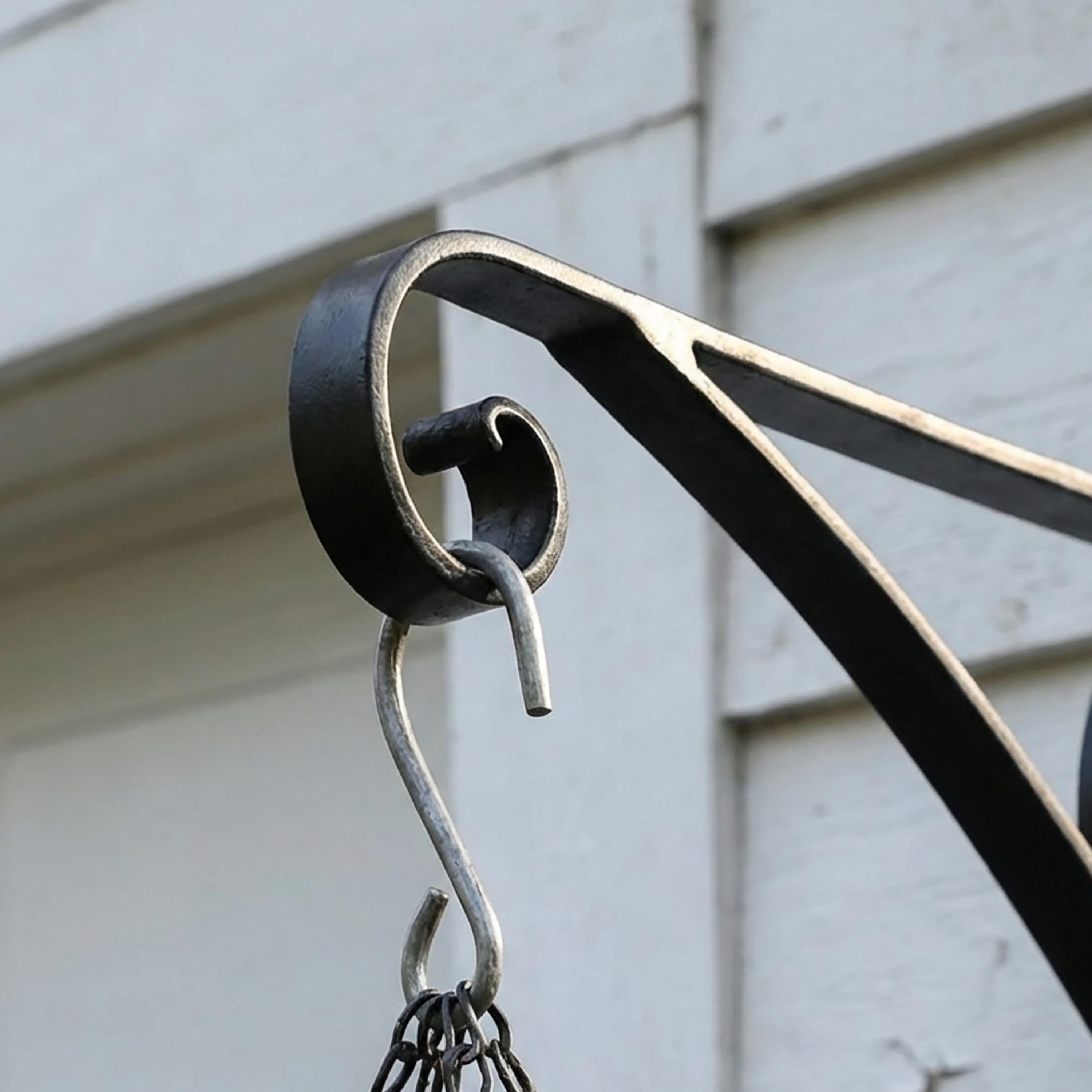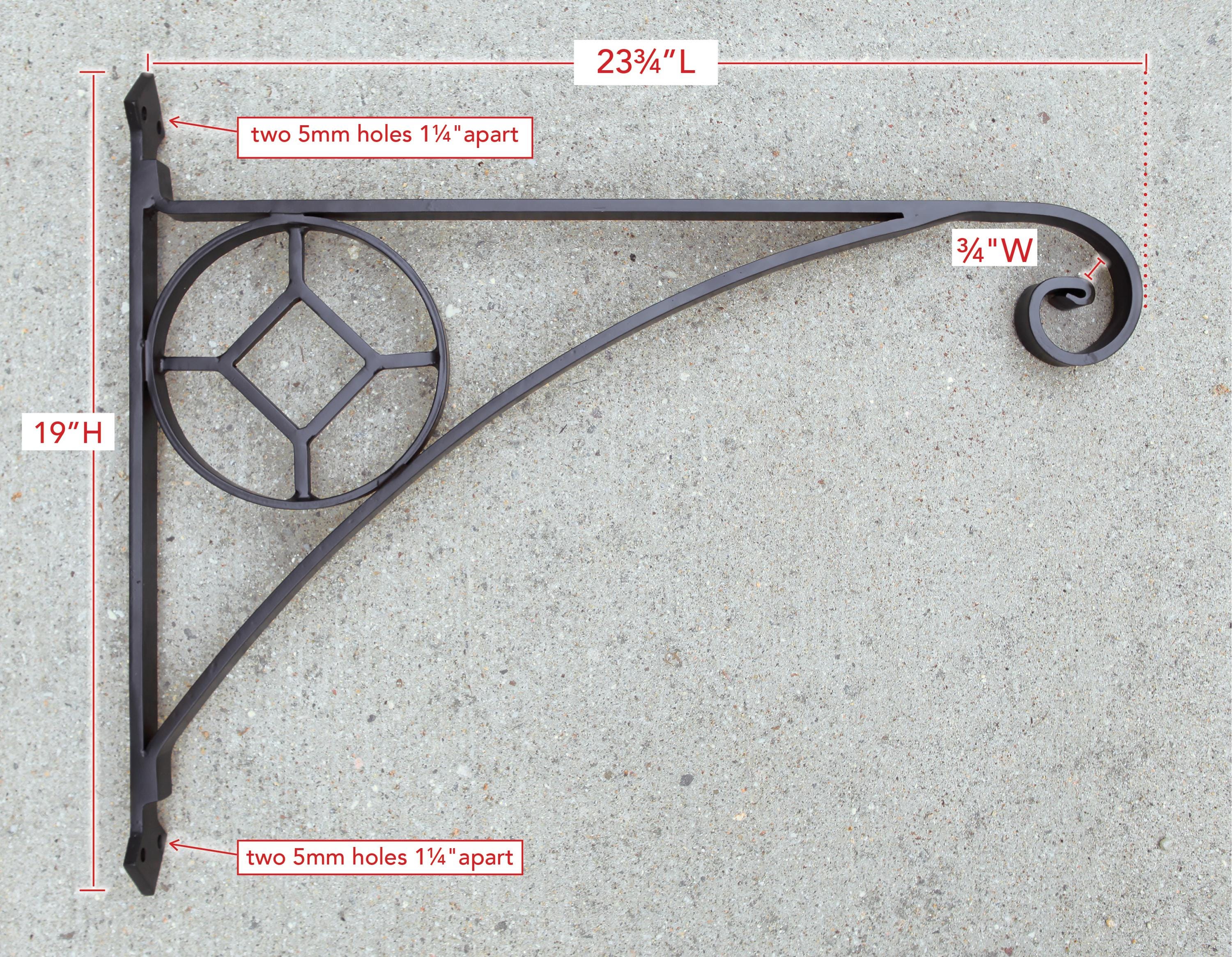 This is a heavy-duty, wall-mounted hanging bracket, hand-forged in a traditional style with a decorative circle motif. Large and sturdy, it is designed to hang larger planters, baskets, or birdbaths, providing about 22" of clearance from the wall. This craftsman-style bracket is also perfect for large wind chimes, lanterns, and bird feeders.