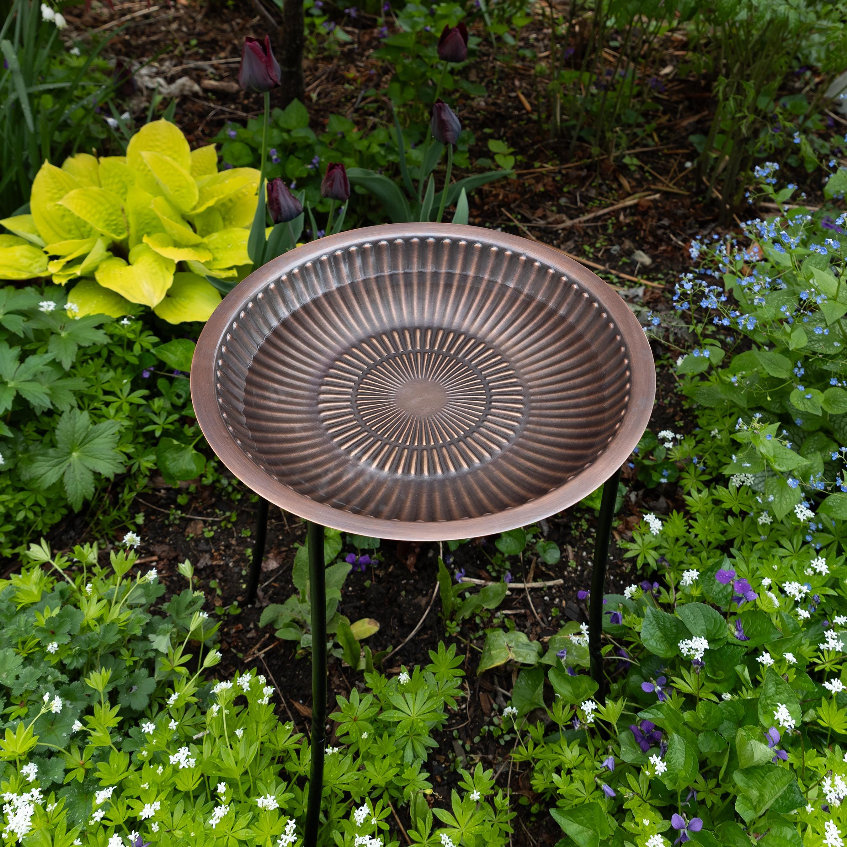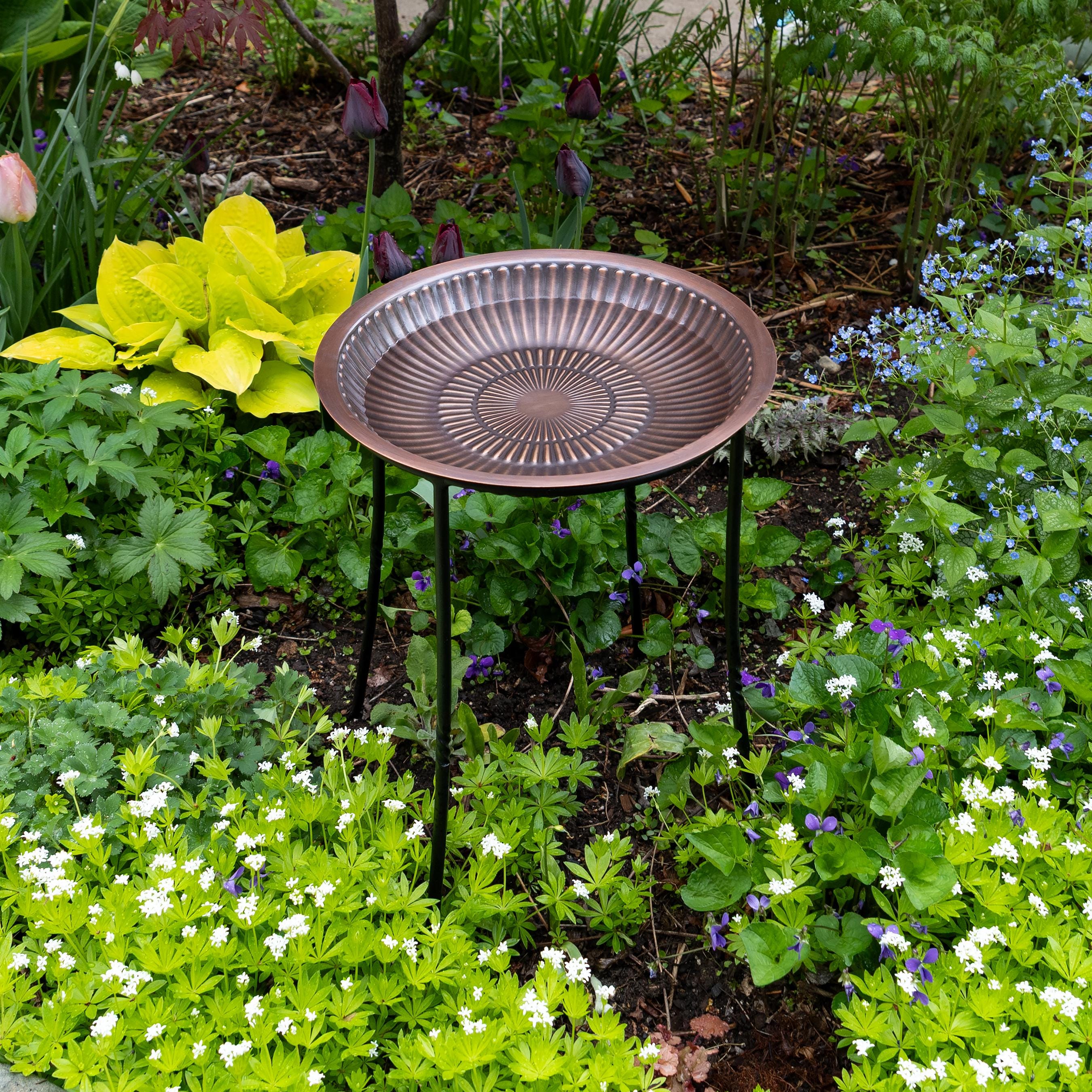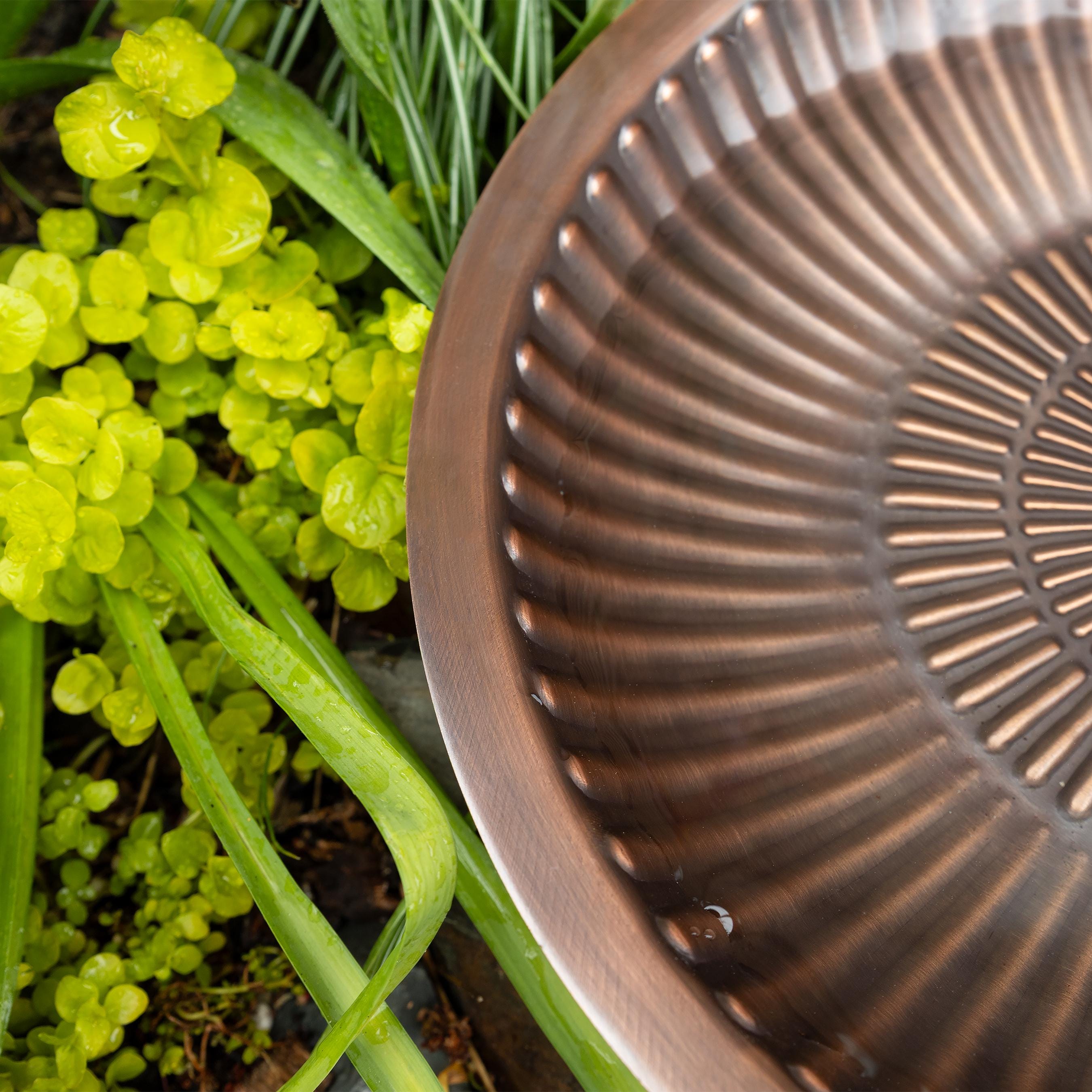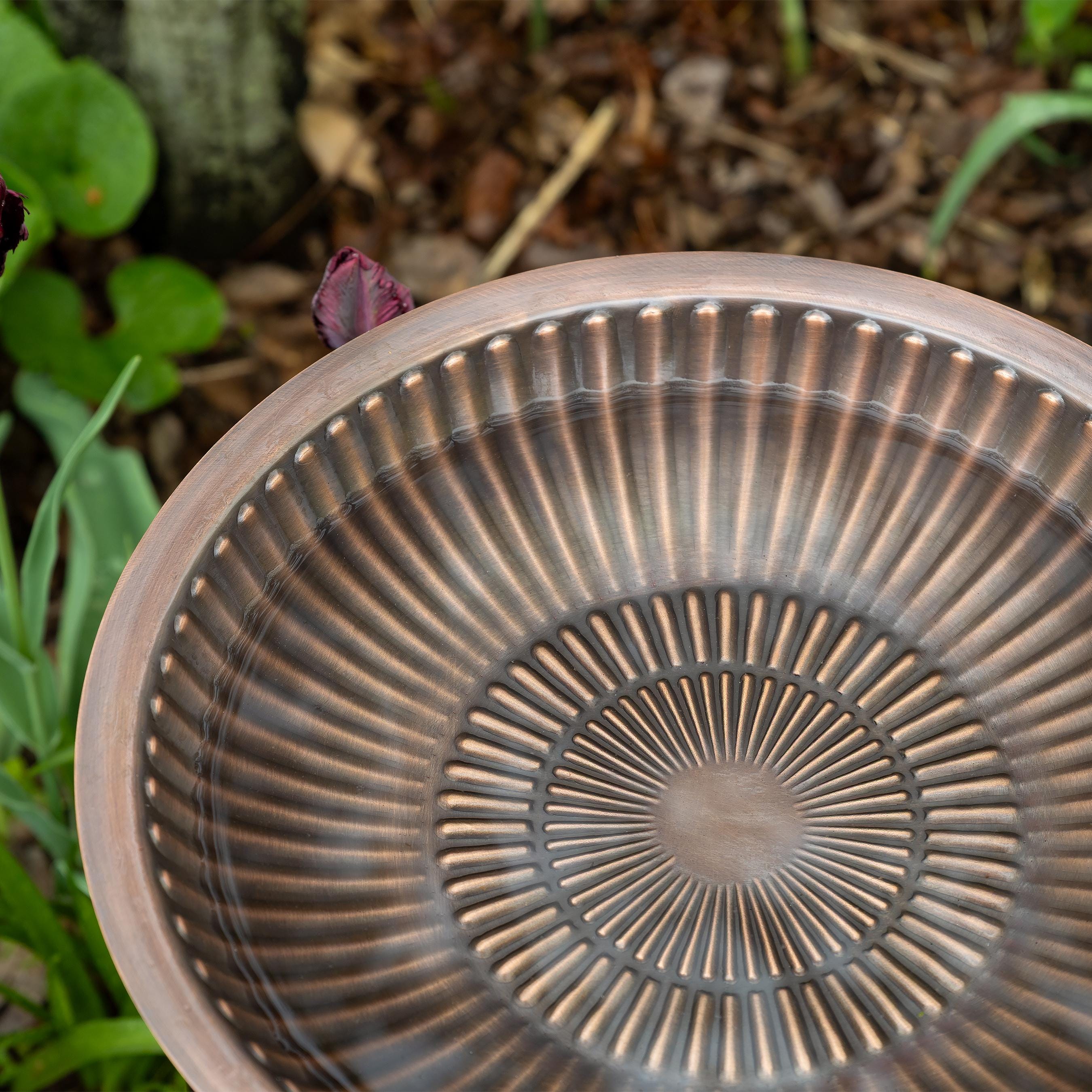 This simple birdbath bowl provides ample landing space for birds to perch and drink or splash around on decks, tabletops, or rock walls. Concentric rings of raised petals are enhanced by the antique finish. Made of copper-plated brass, this birdbath will never rust outdoors and will instead develop its own natural patina over time. This birdbath bowl has a flat bottom for use on any surface or add your own stand. Fits in  our 18"H Simple Ring Plant Stand, sold separately: https://forgeandflower.etsy.com/listing/1541626737