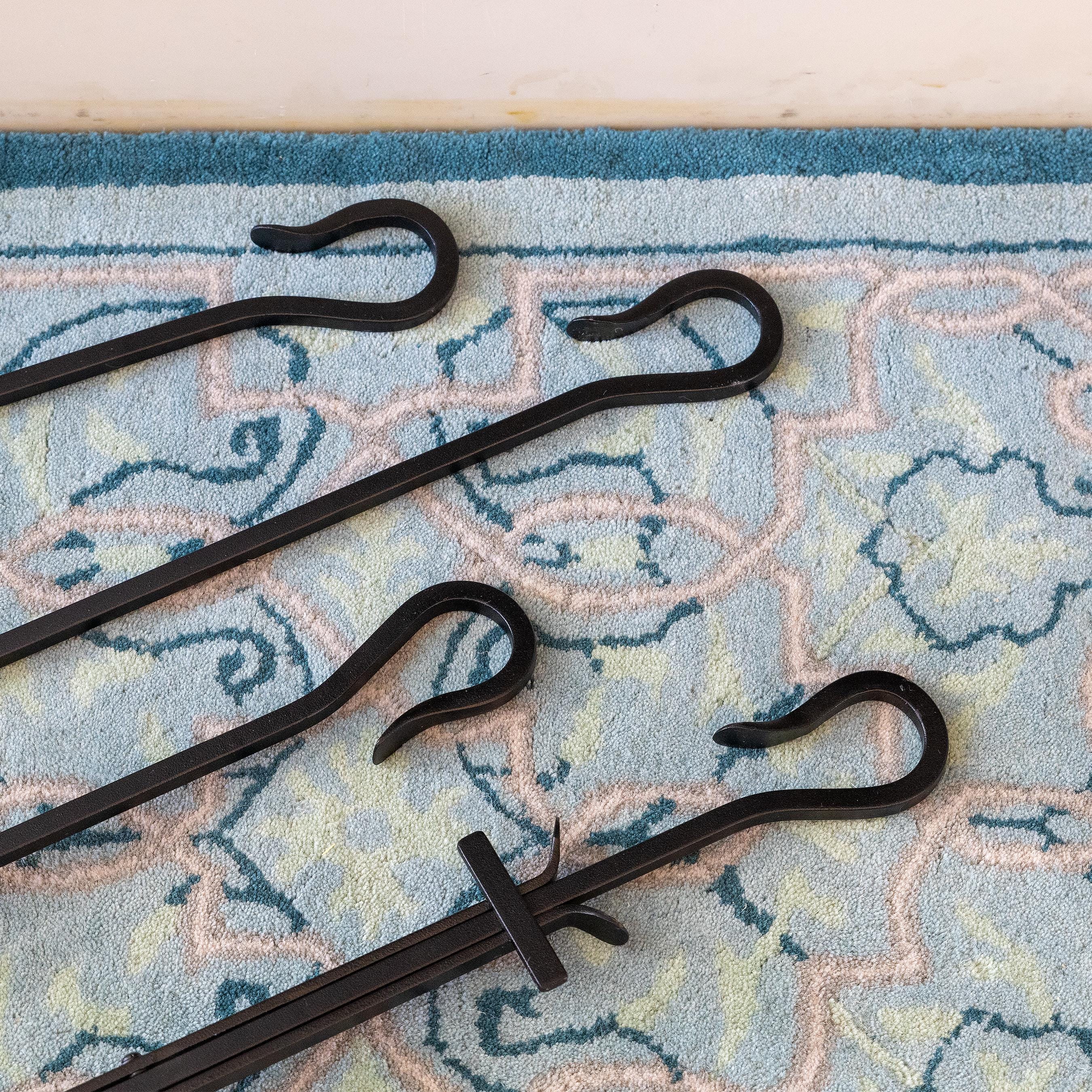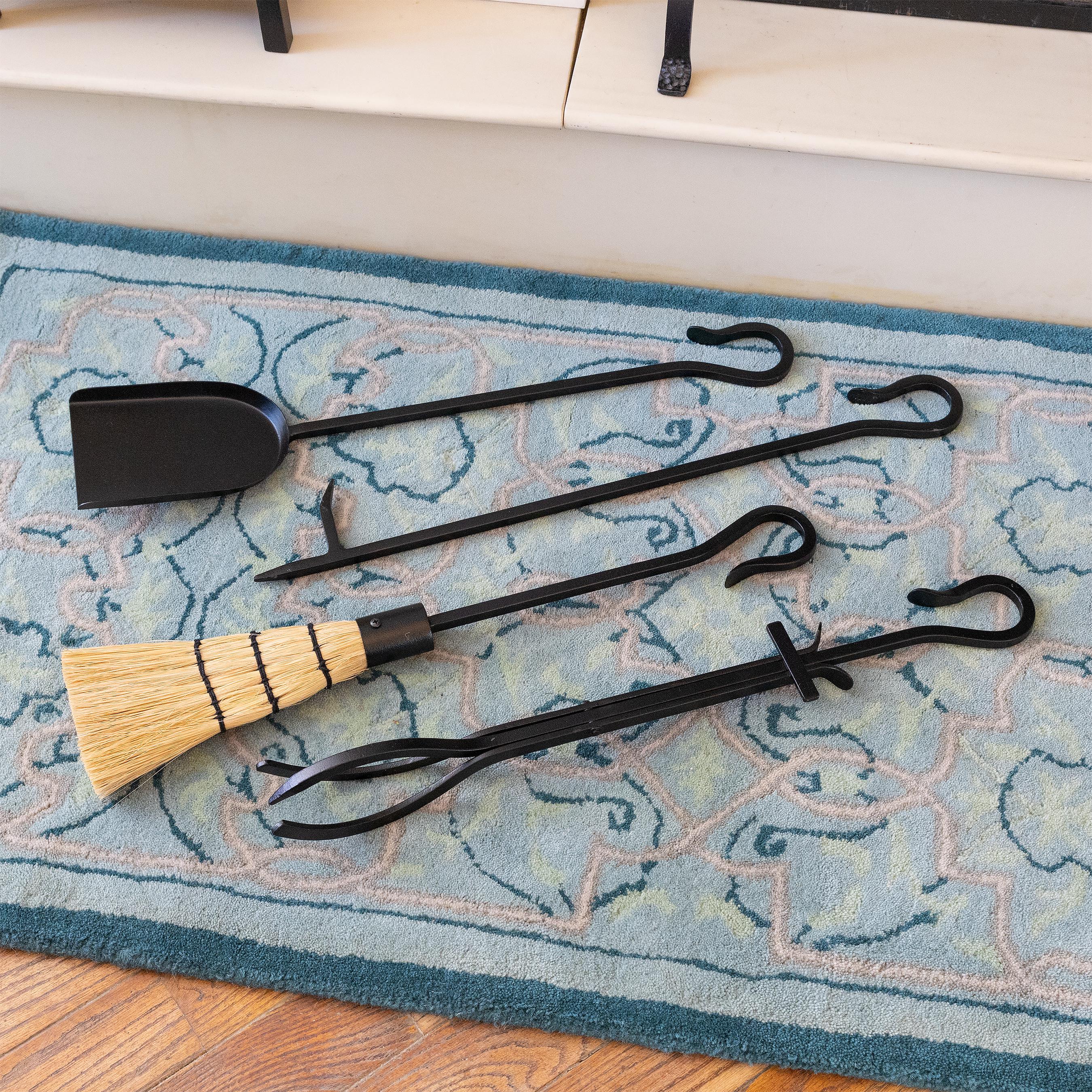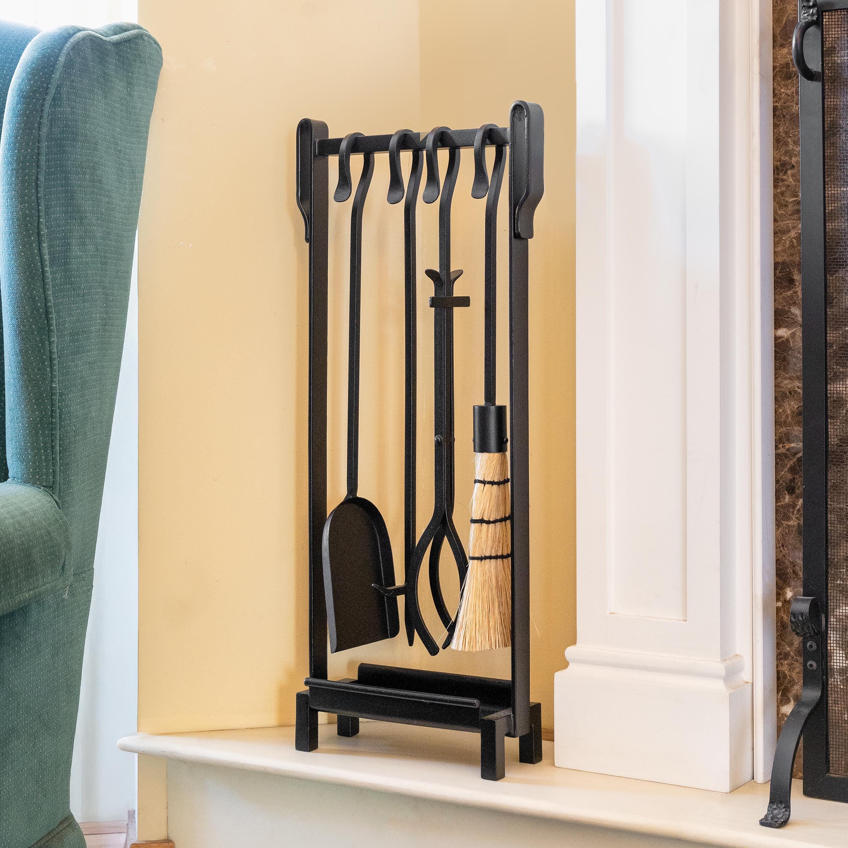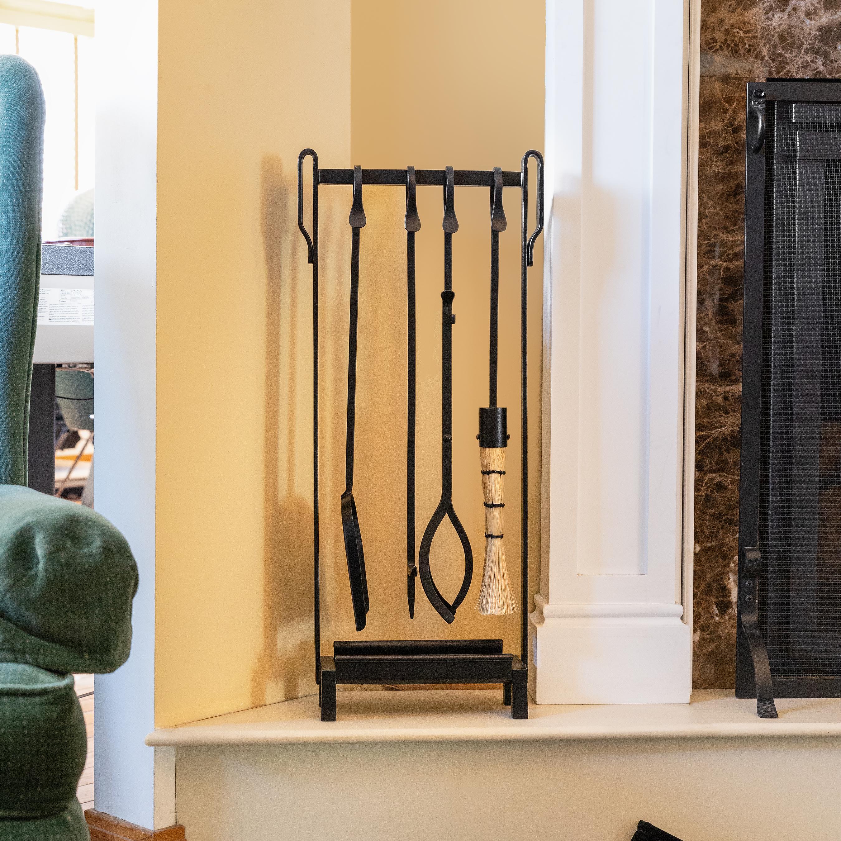 This is a compact tool set with traditionally forged shepherd's Hook handles. With tools hung in a row, it can fit on a narrow hearth ledge or be tucked against the wall. Four tools hang on the top bar- Poker, three-point Tongs, Ash Shovel and the natural sorghum fiber Brush. A built-in ash pan at the bottom of the stand keeps debris contained.
