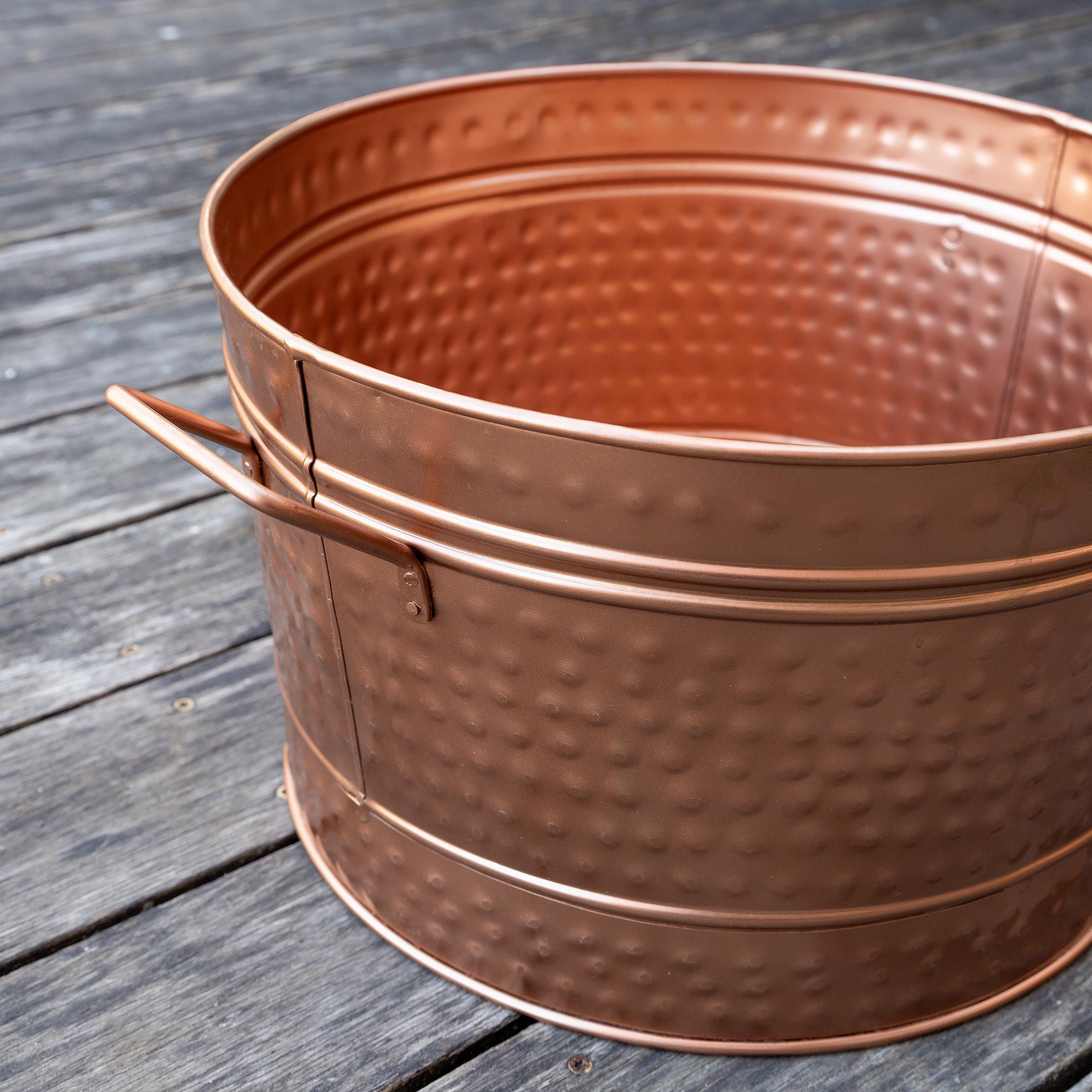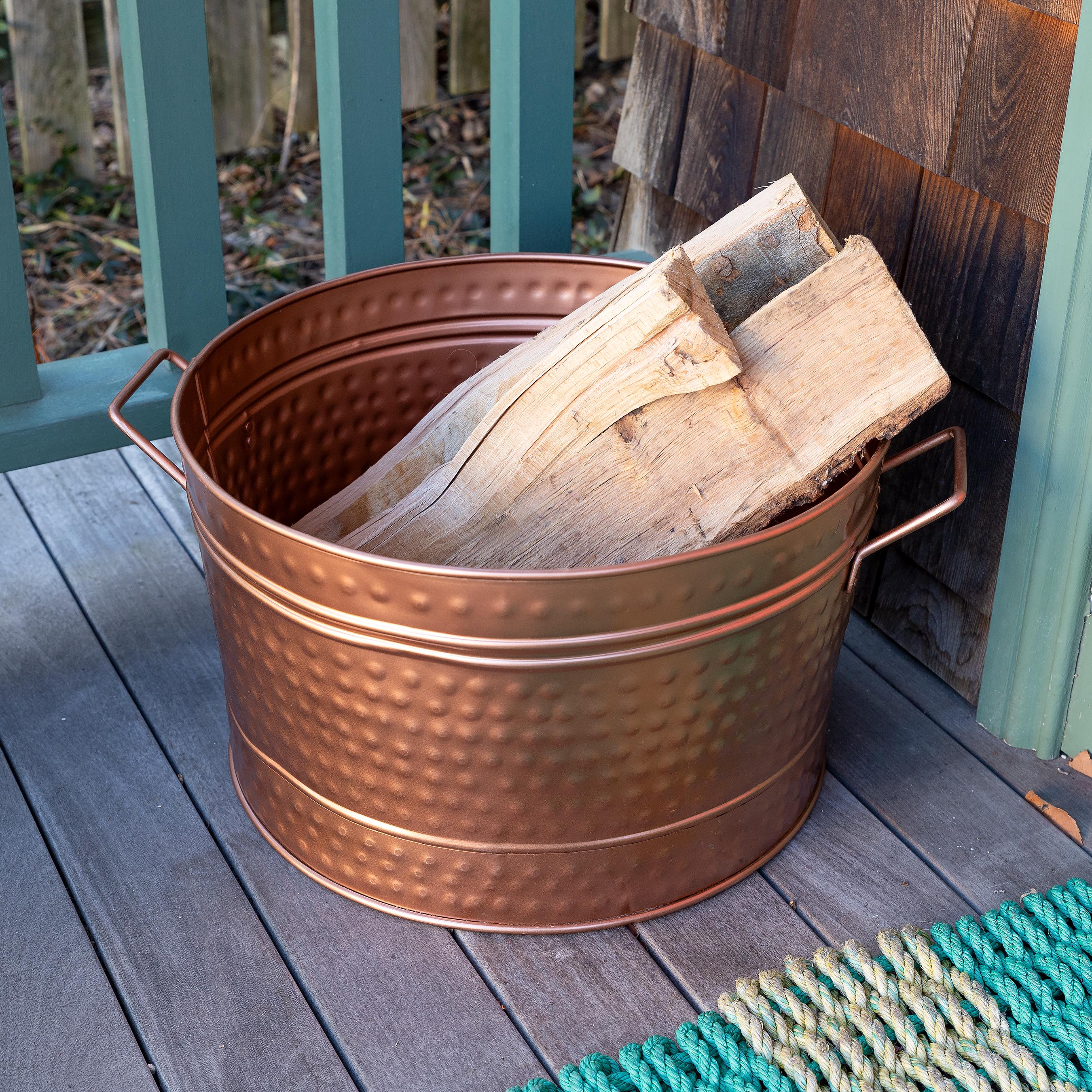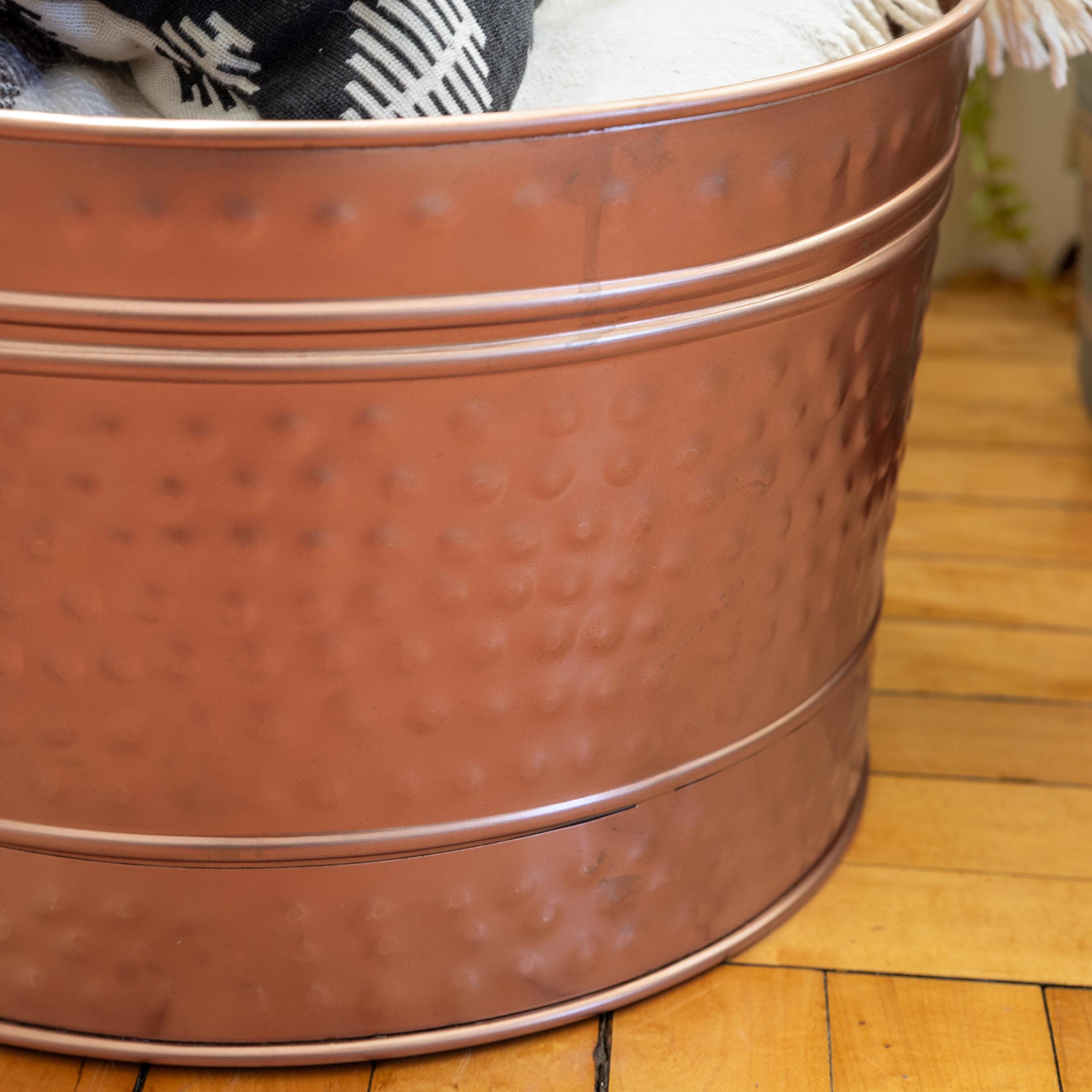 This round copper tub has a vintage farmhouse style with a warm copper plated finish. The hammered texture gives it a soft undulating glow. Toss in throw blankets and pillows or firewood, as shown. Suitable for many things- wash a dog, chill some champagne, hide some ugly plastic planters, elevate your recycling or laundry! Two side handles make it easy to move.