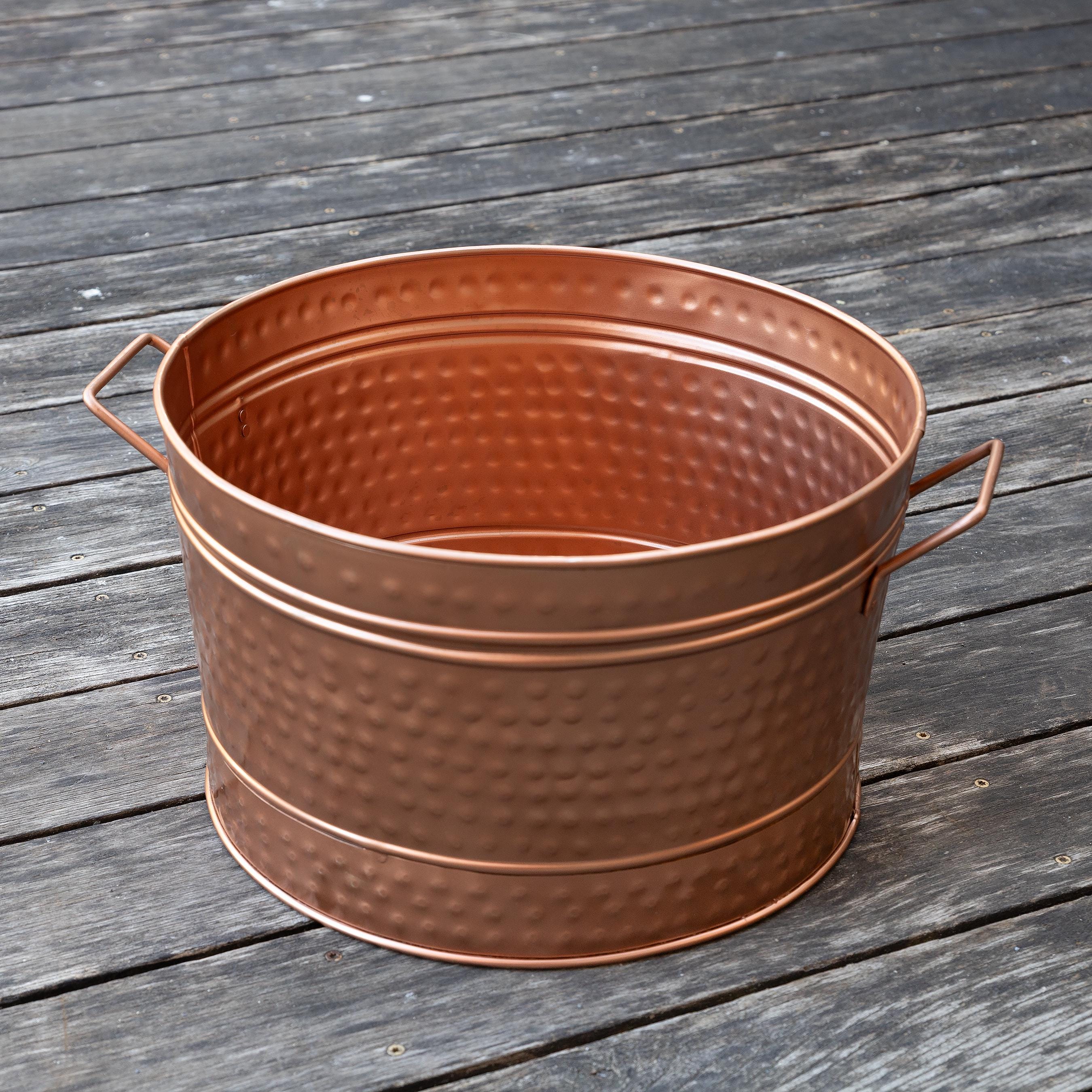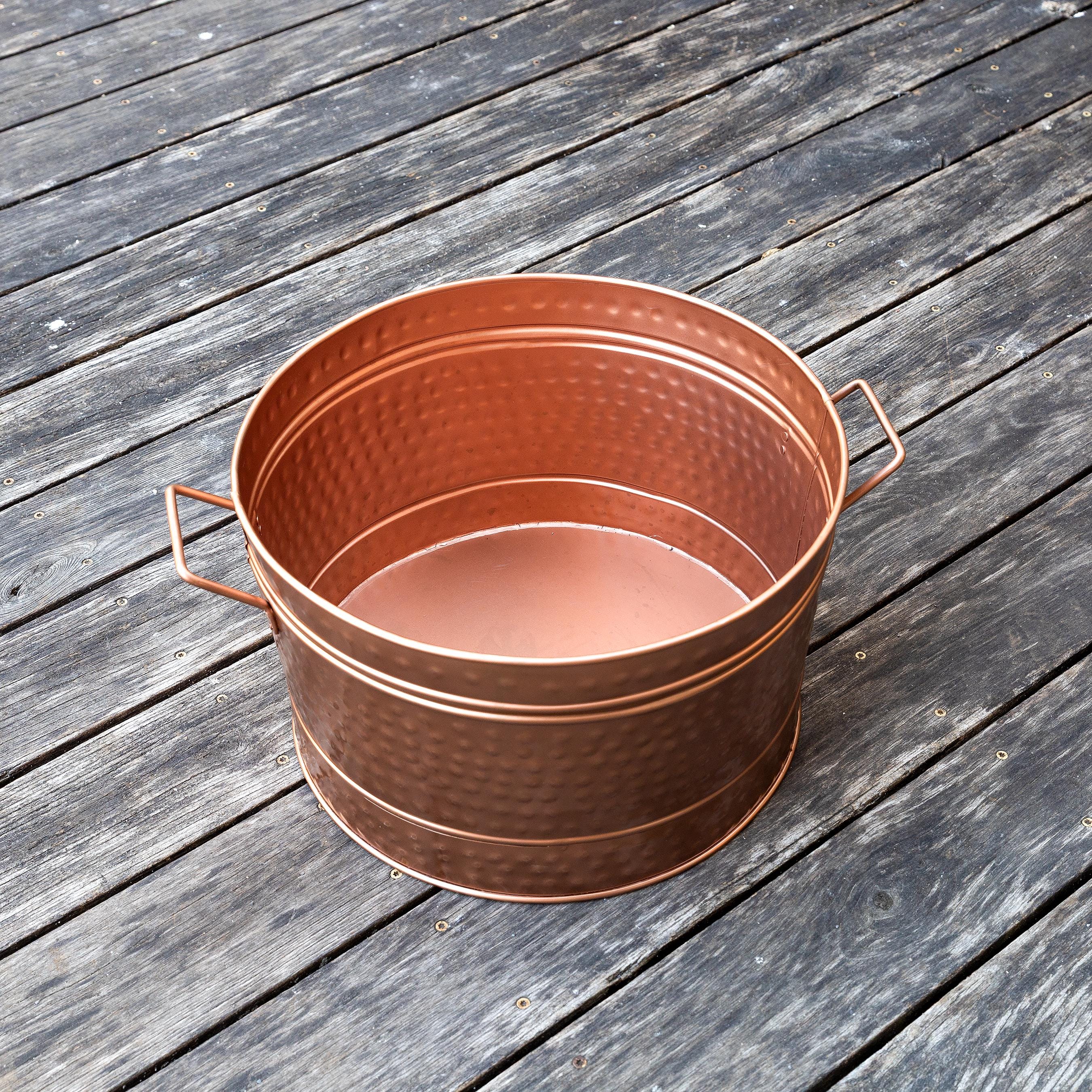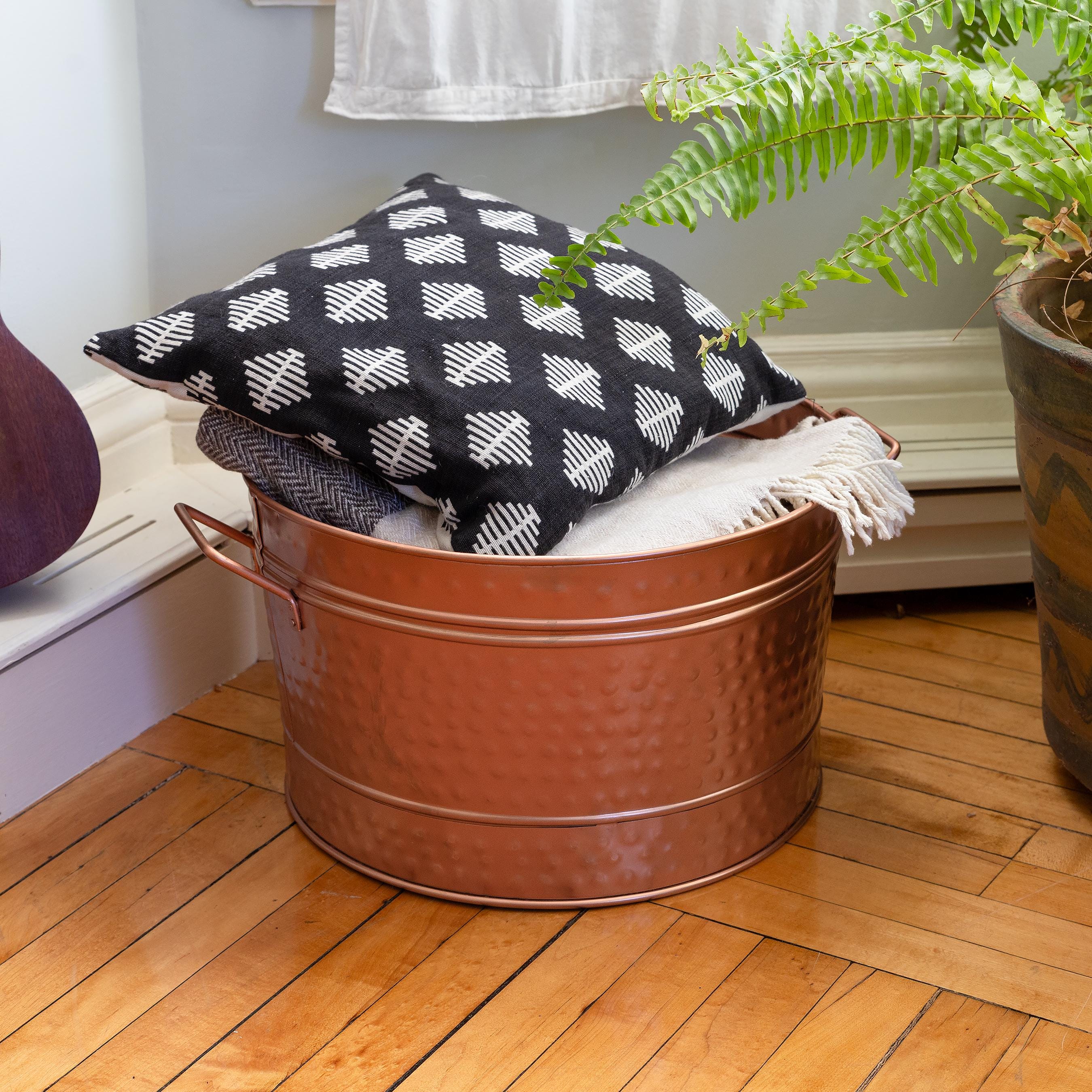 This round copper tub has a vintage farmhouse style with a warm copper plated finish. The hammered texture gives it a soft undulating glow. Toss in throw blankets and pillows or firewood, as shown. Suitable for many things- wash a dog, chill some champagne, hide some ugly plastic planters, elevate your recycling or laundry! Two side handles make it easy to move.