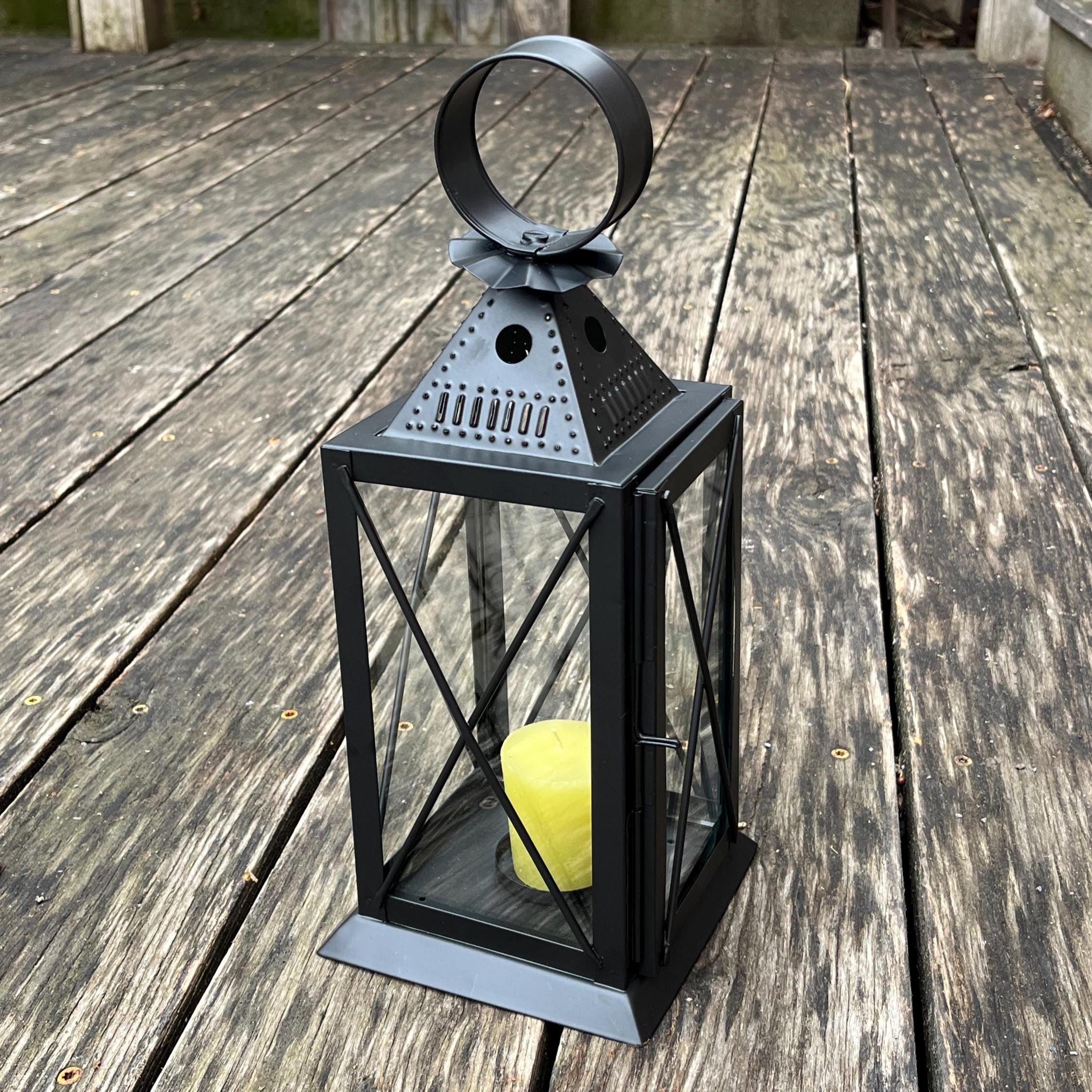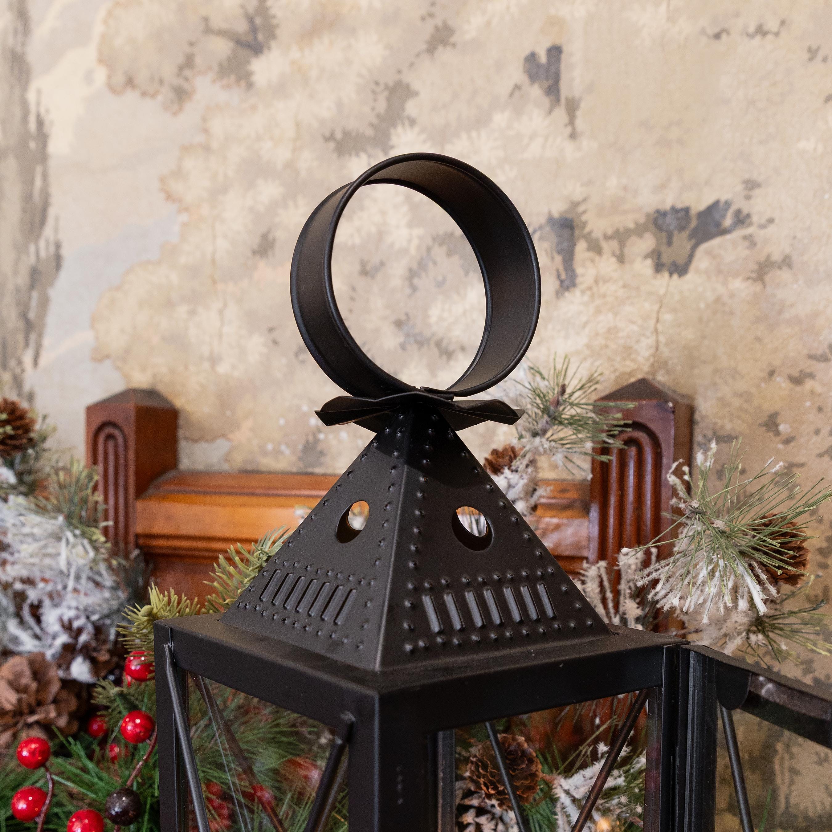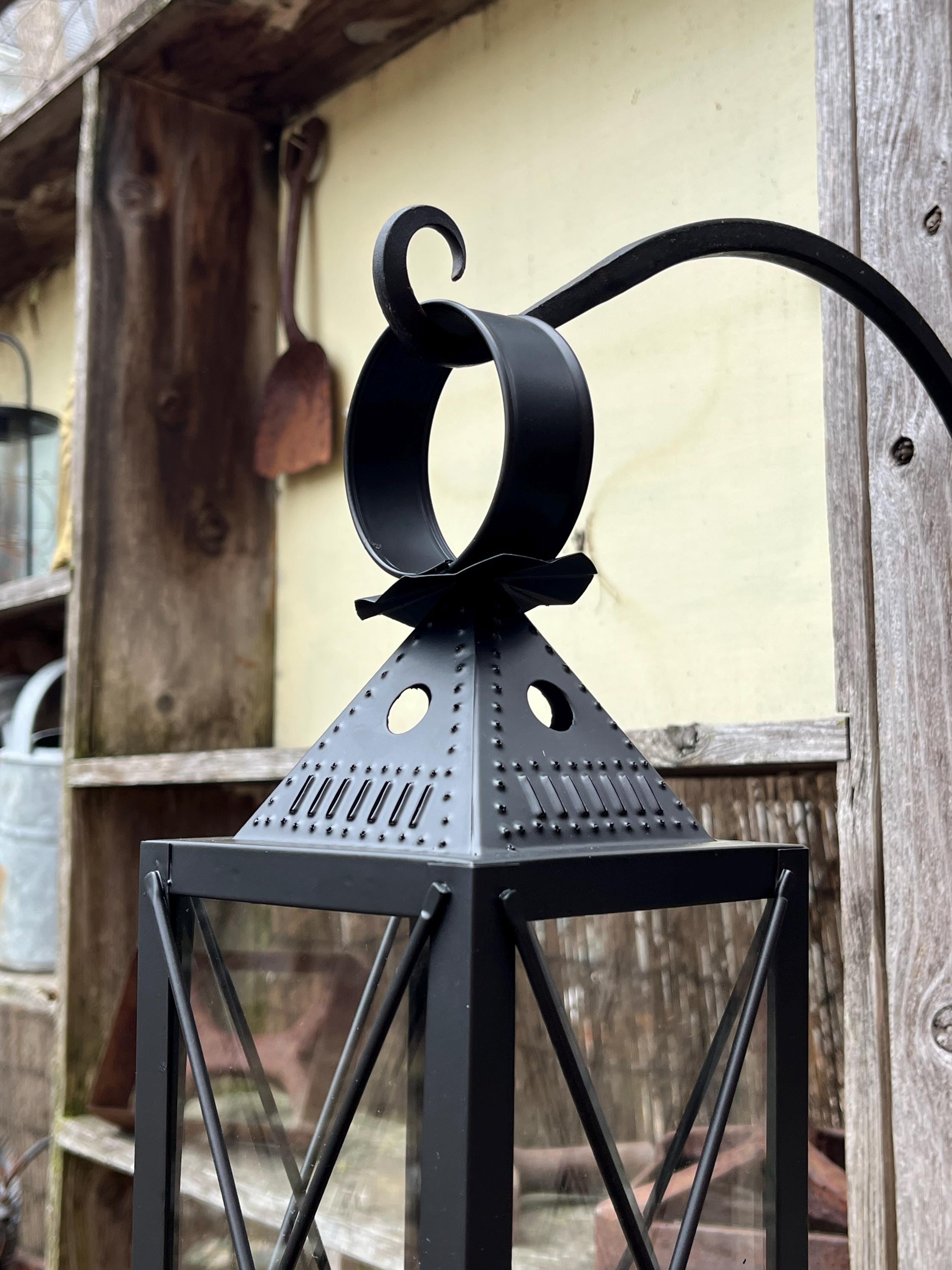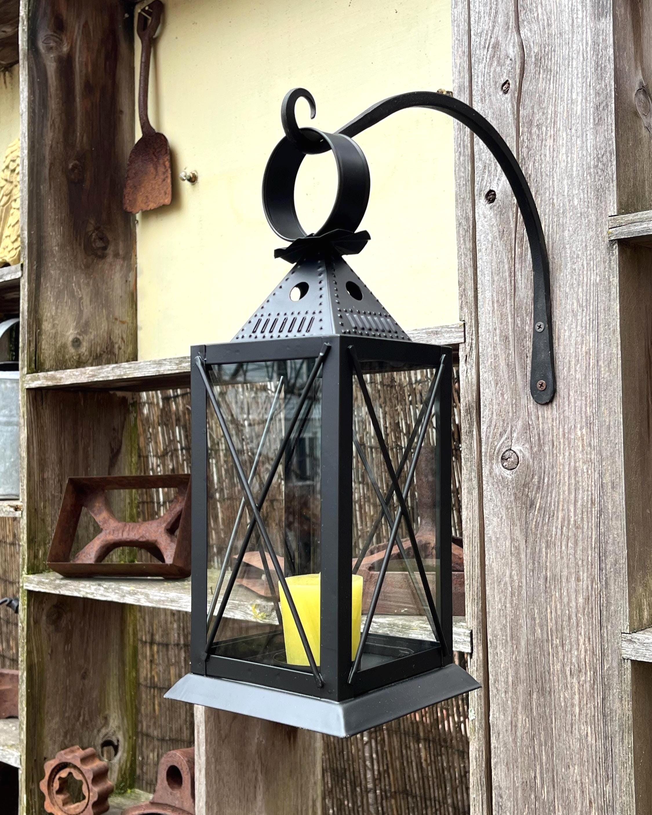 Based on the traditional American punched tin lanterns that were hung to welcome guests and travelers, our version is hand-crafted from punched steel with glass panels and a hinged door. Use the lantern with a conventional wax or modern LED pillar or votive candle. Hang it from one of our wrought iron hooks on a porch or post, or give your outdoor dining area a gentle glow.