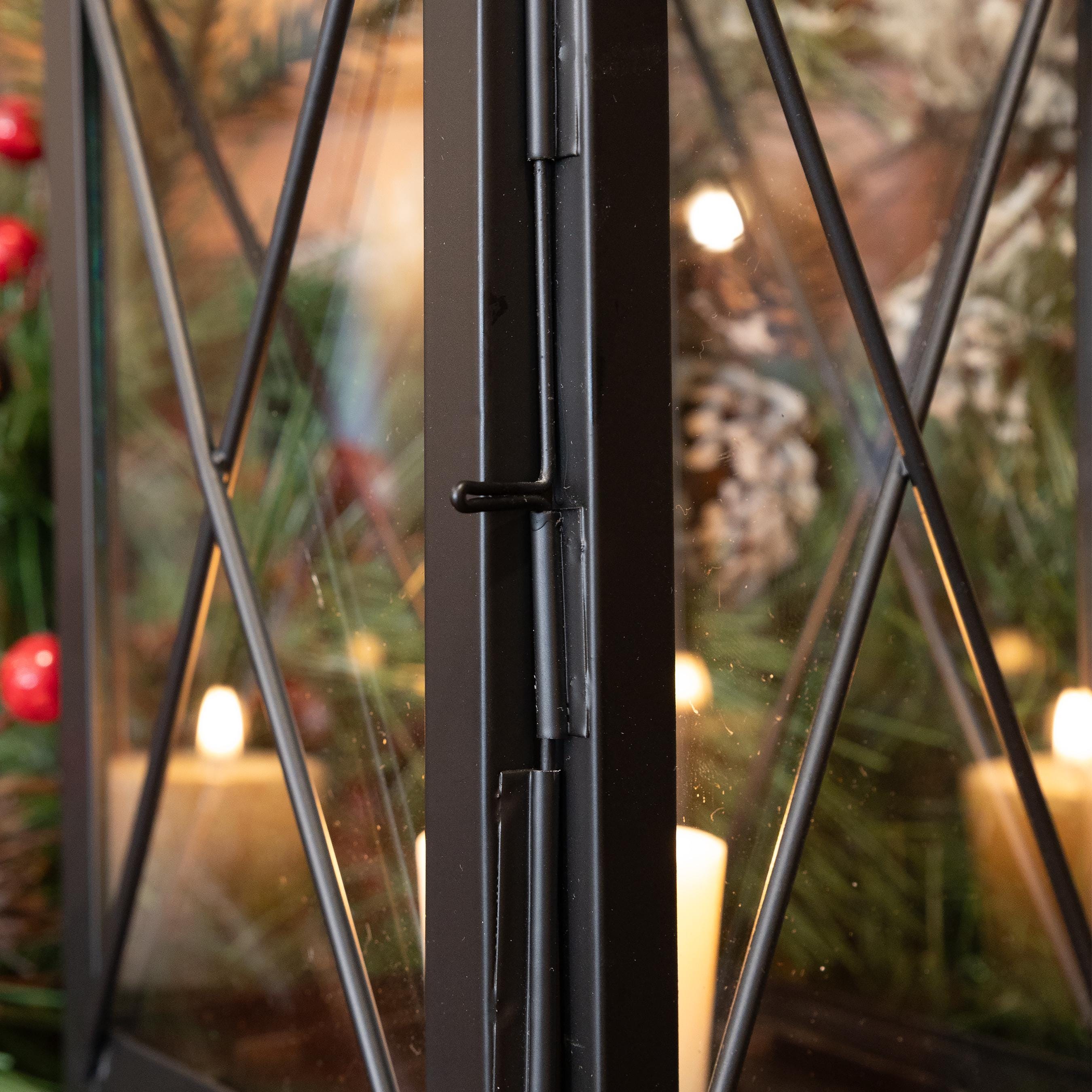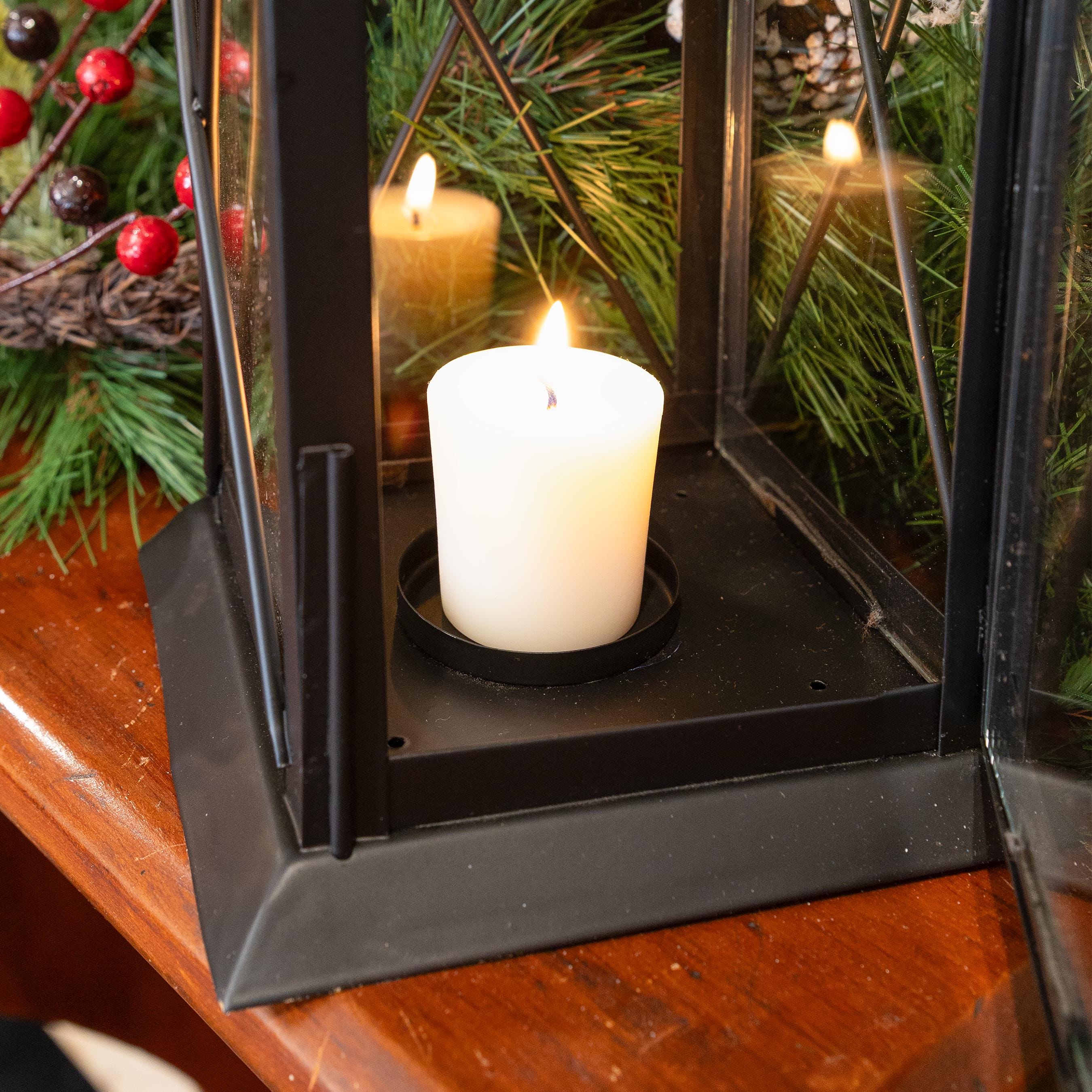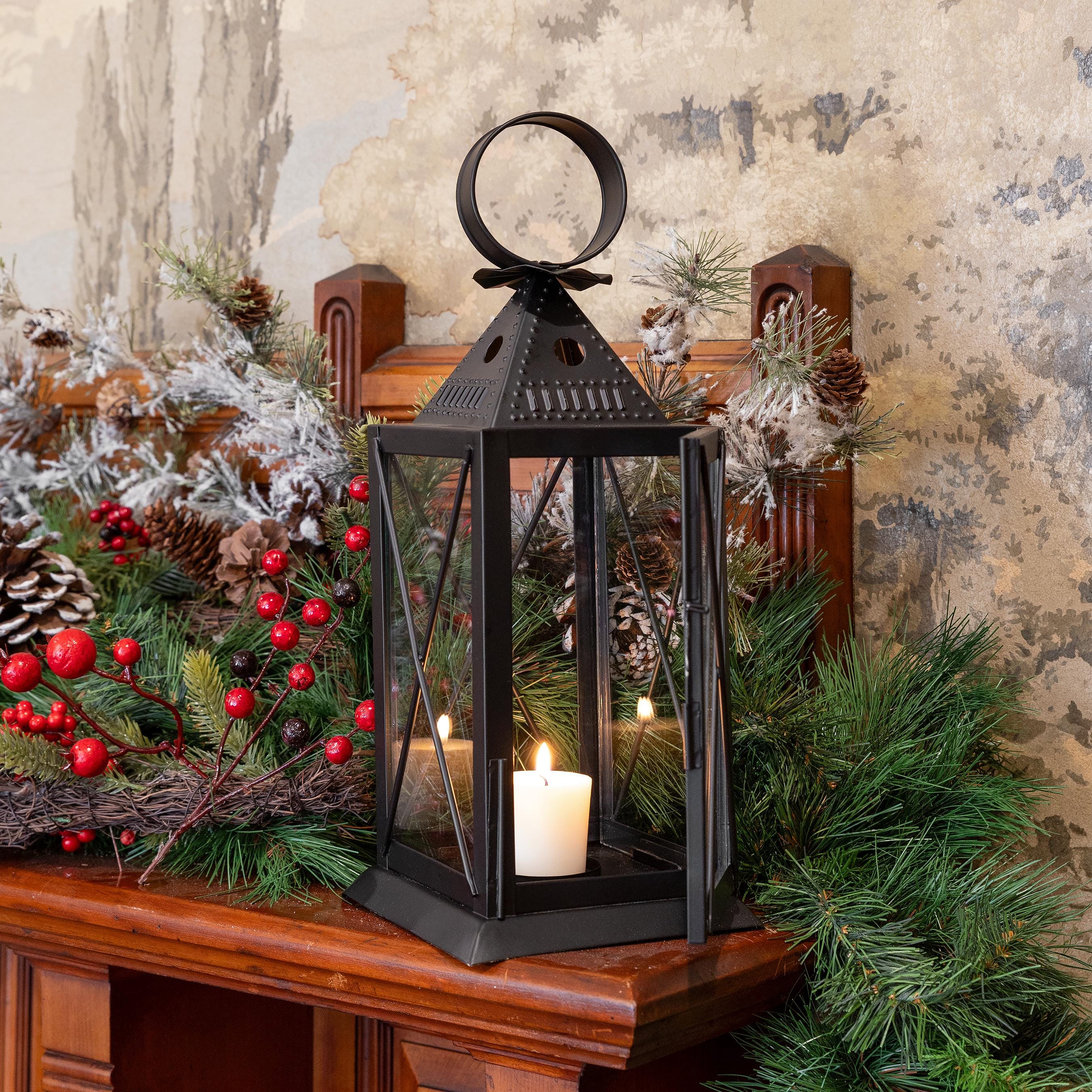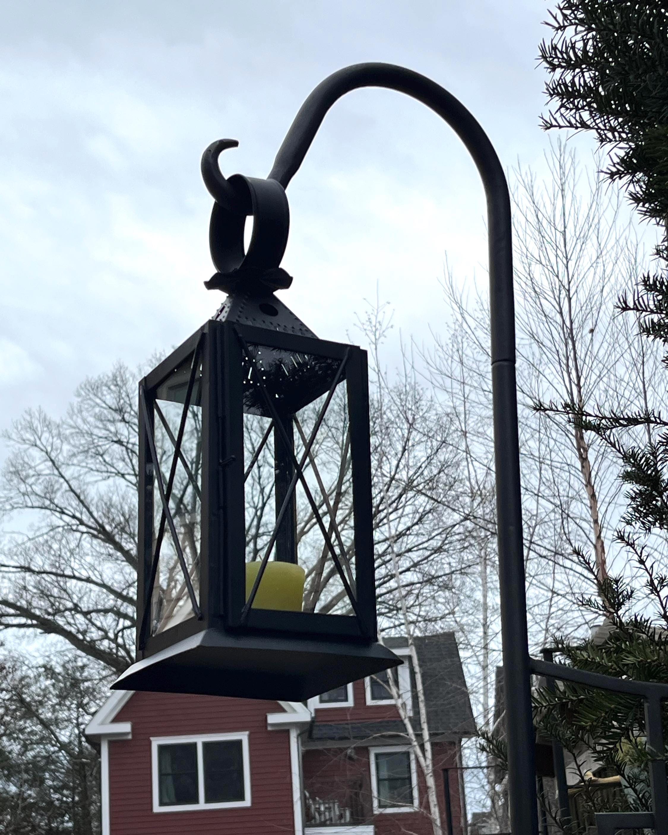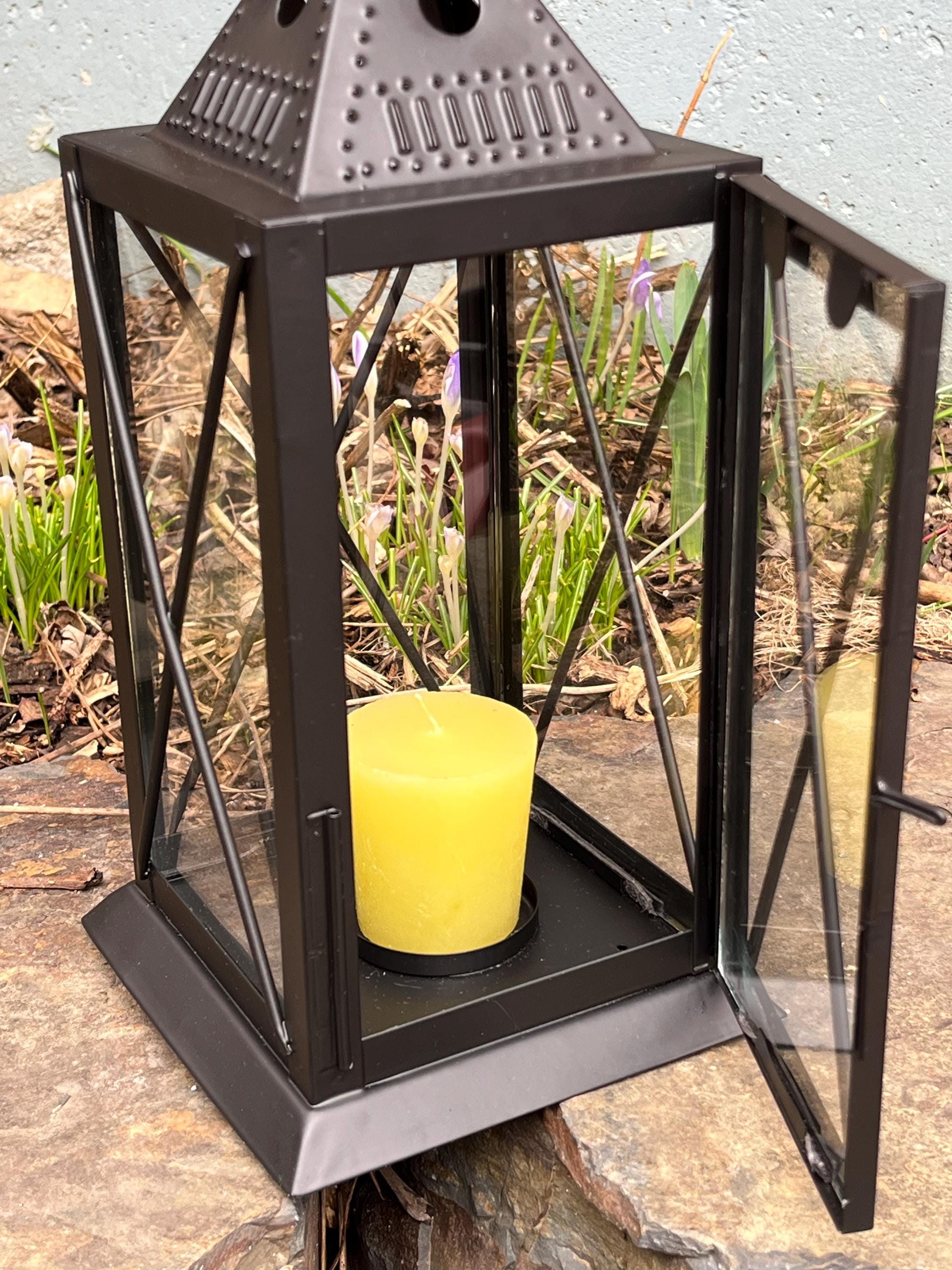 Based on the traditional American punched tin lanterns that were hung to welcome guests and travelers, our version is hand-crafted from punched steel with glass panels and a hinged door. Use the lantern with a conventional wax or modern LED pillar or votive candle. Hang it from one of our wrought iron hooks on a porch or post, or give your outdoor dining area a gentle glow.