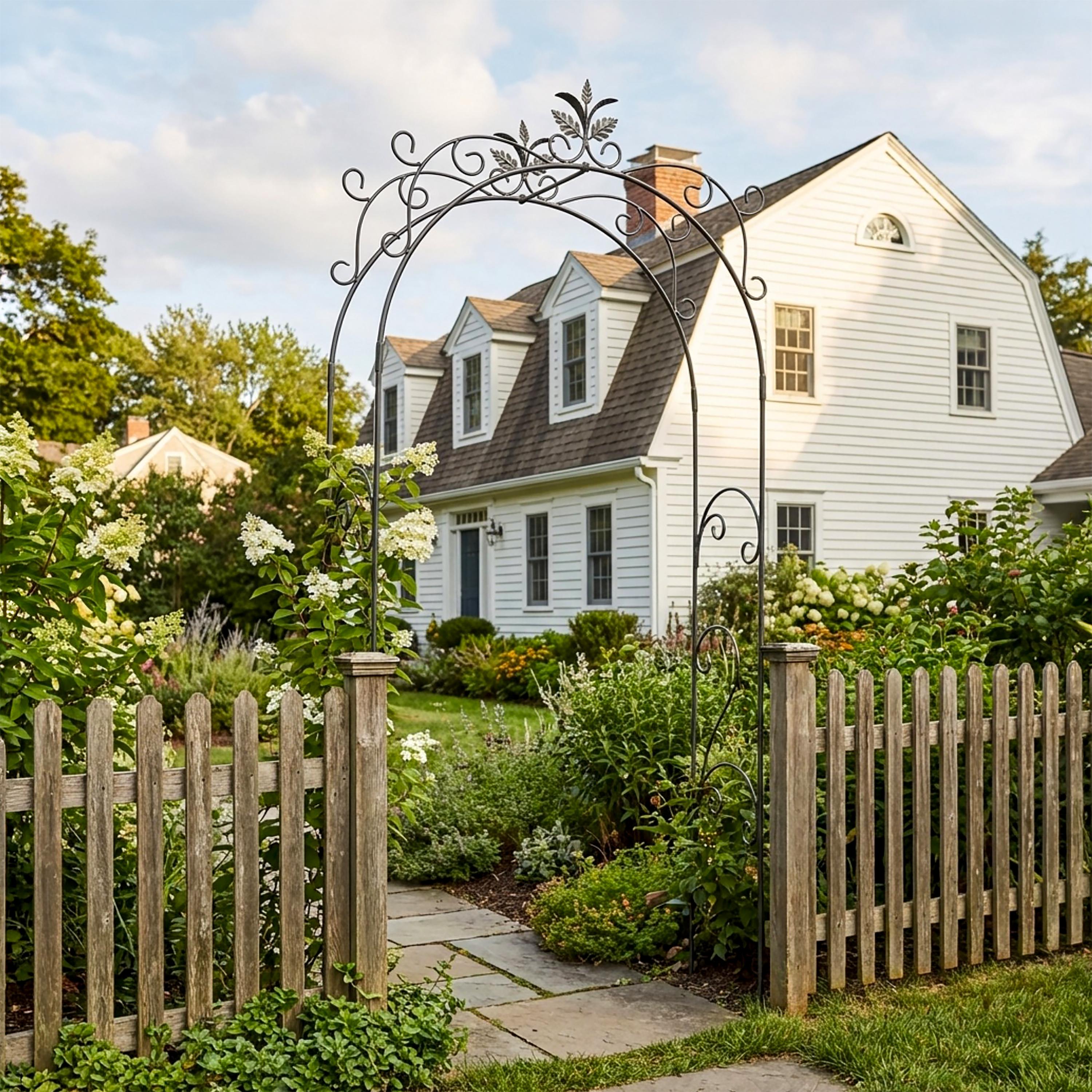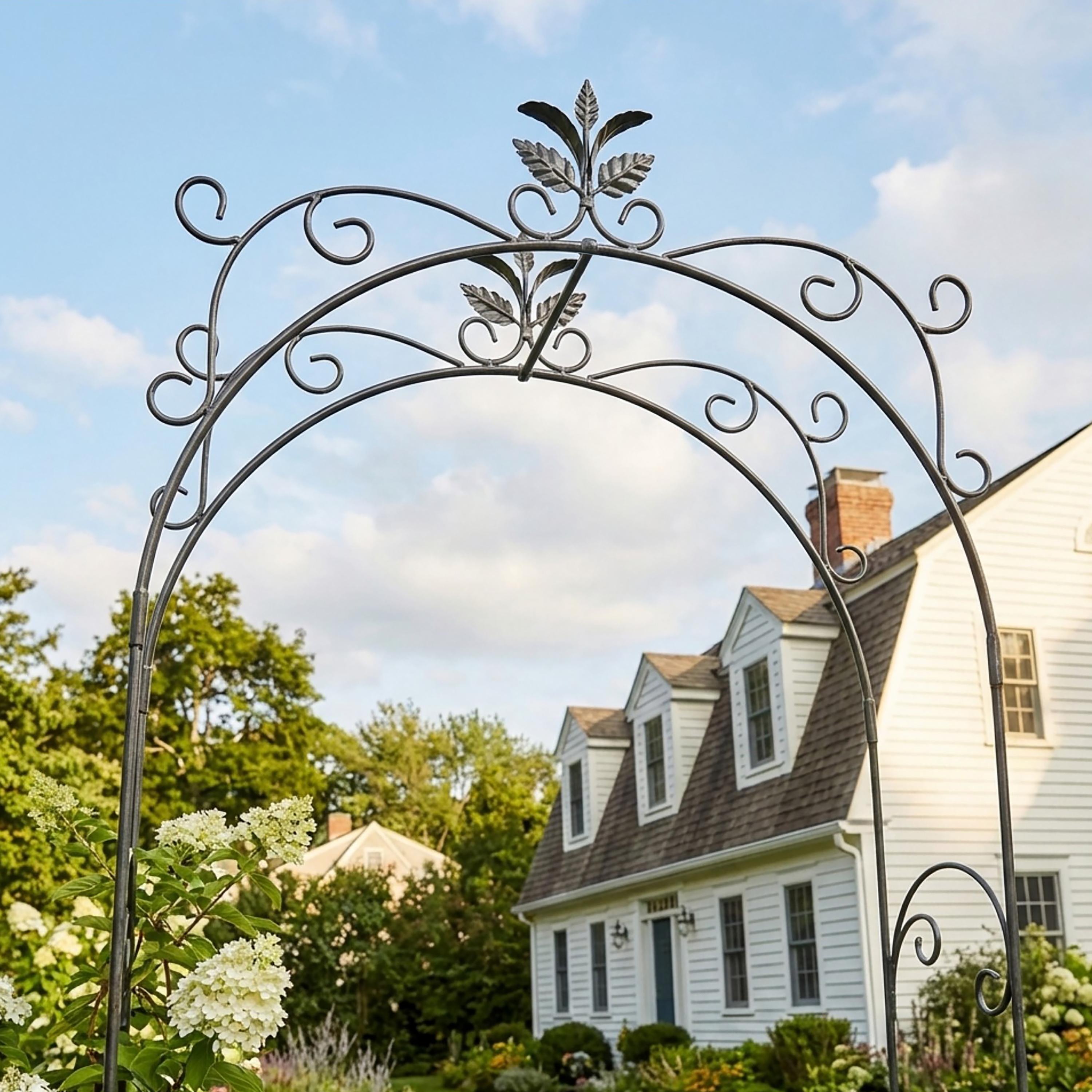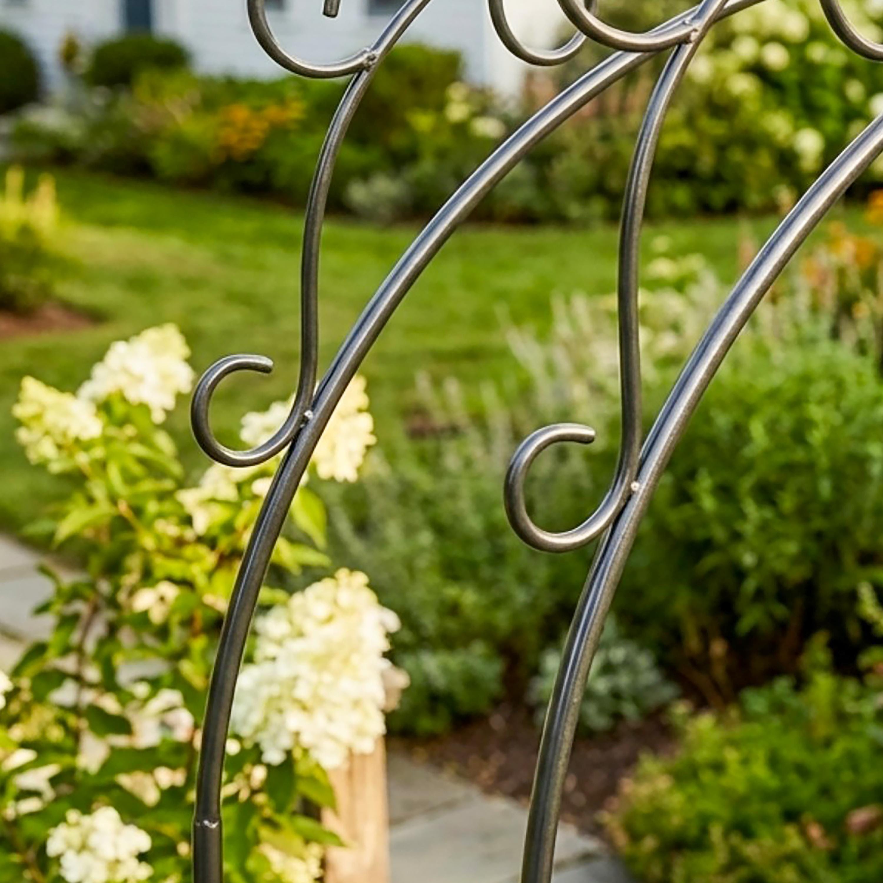 This sturdy wrought iron garden arbor makes a beautiful and welcoming entrance to the garden. This arch is tall and wide enough to grow an archway of blooming vines over a path with plenty of space to walk through. The sturdy wrought iron can support perennial plantings such as roses, hydrangeas, or clematis, as well as annuals such as scarlet runner beans or sweet peas.