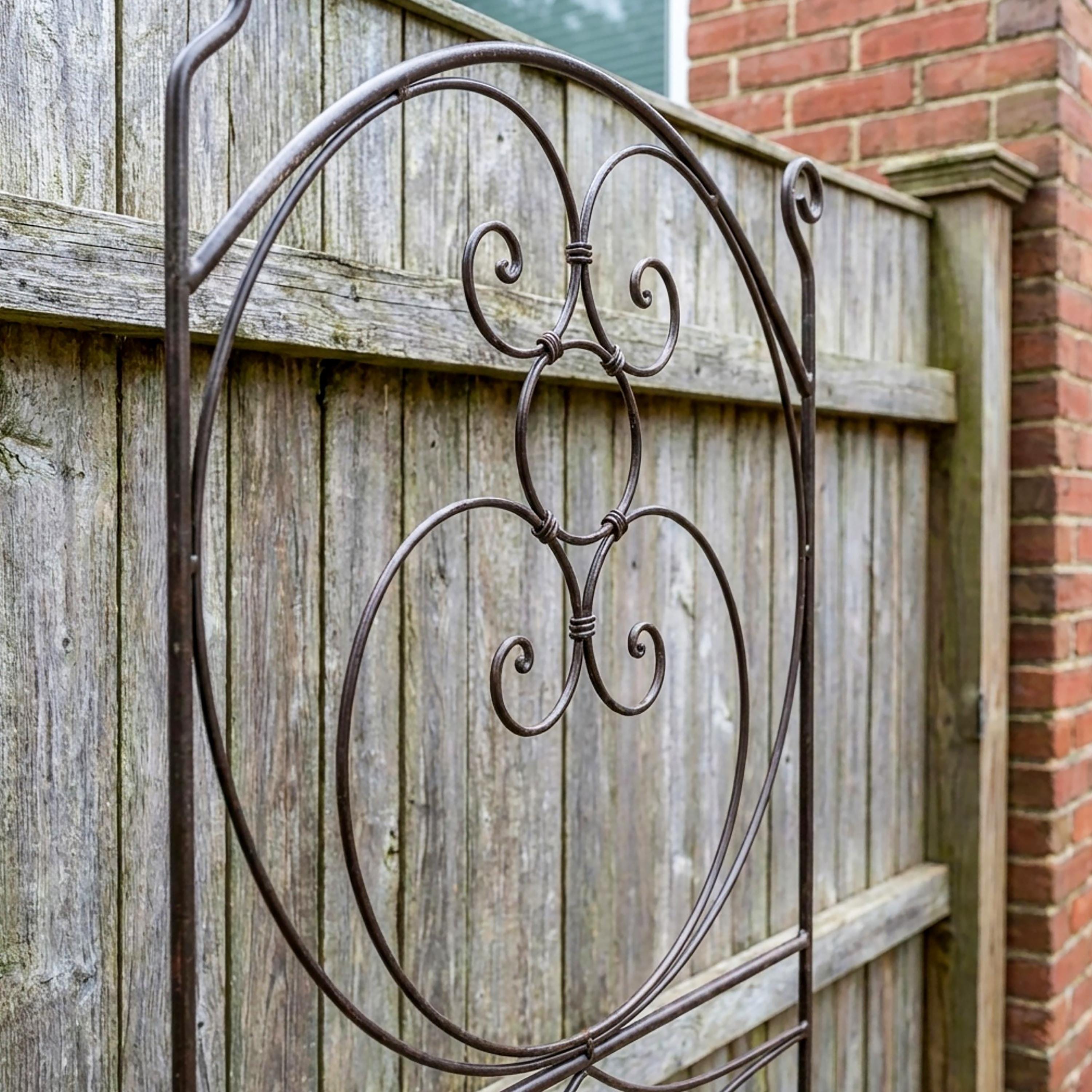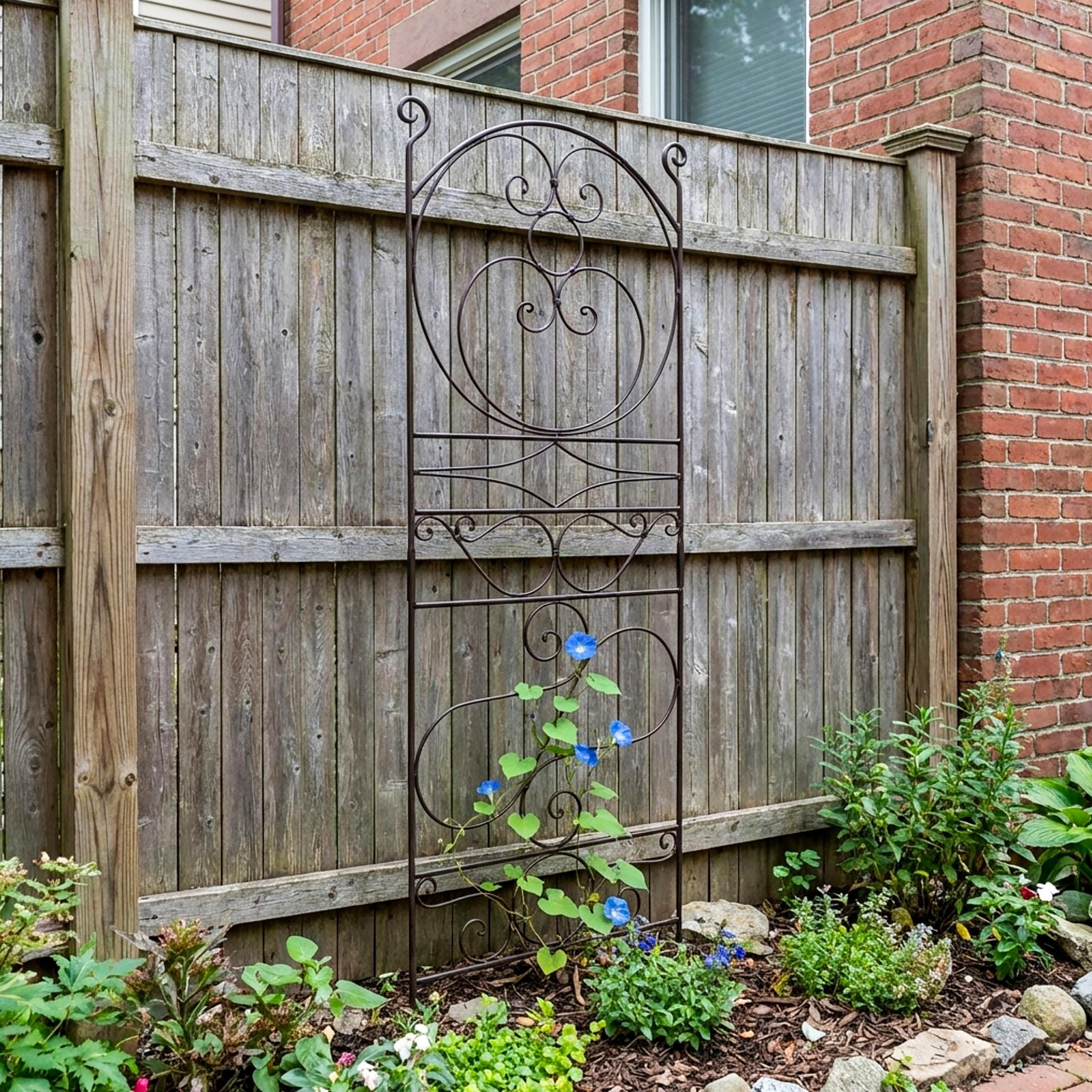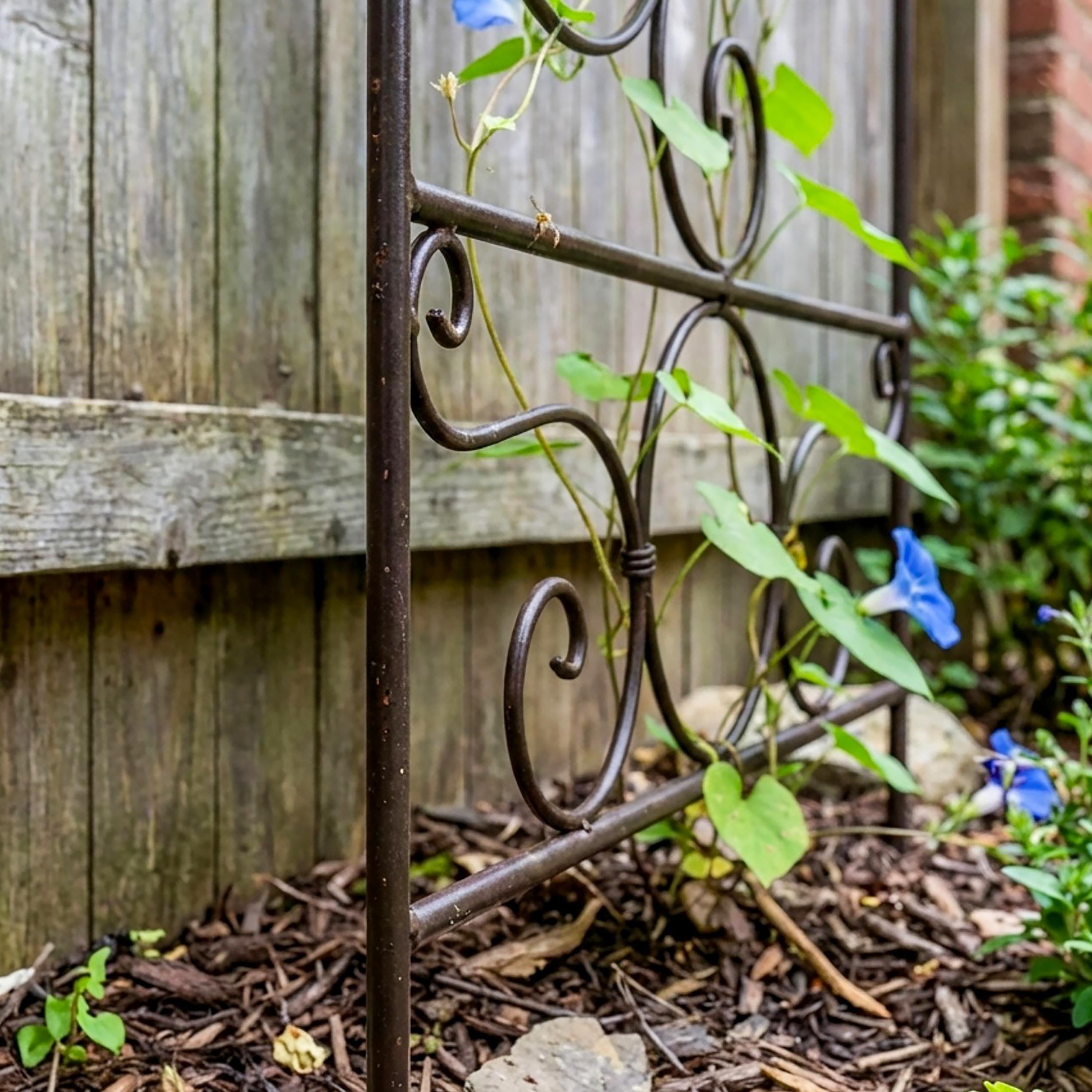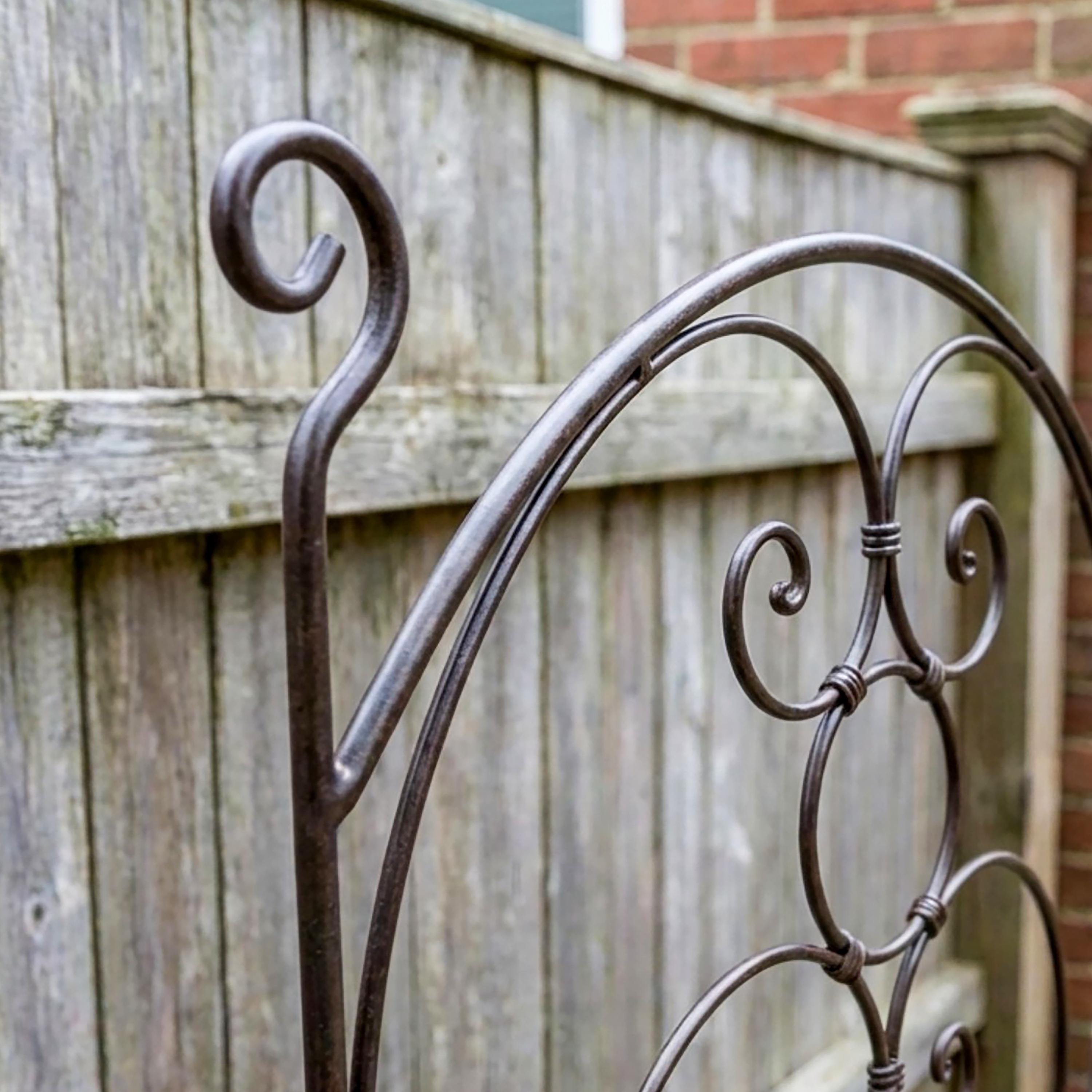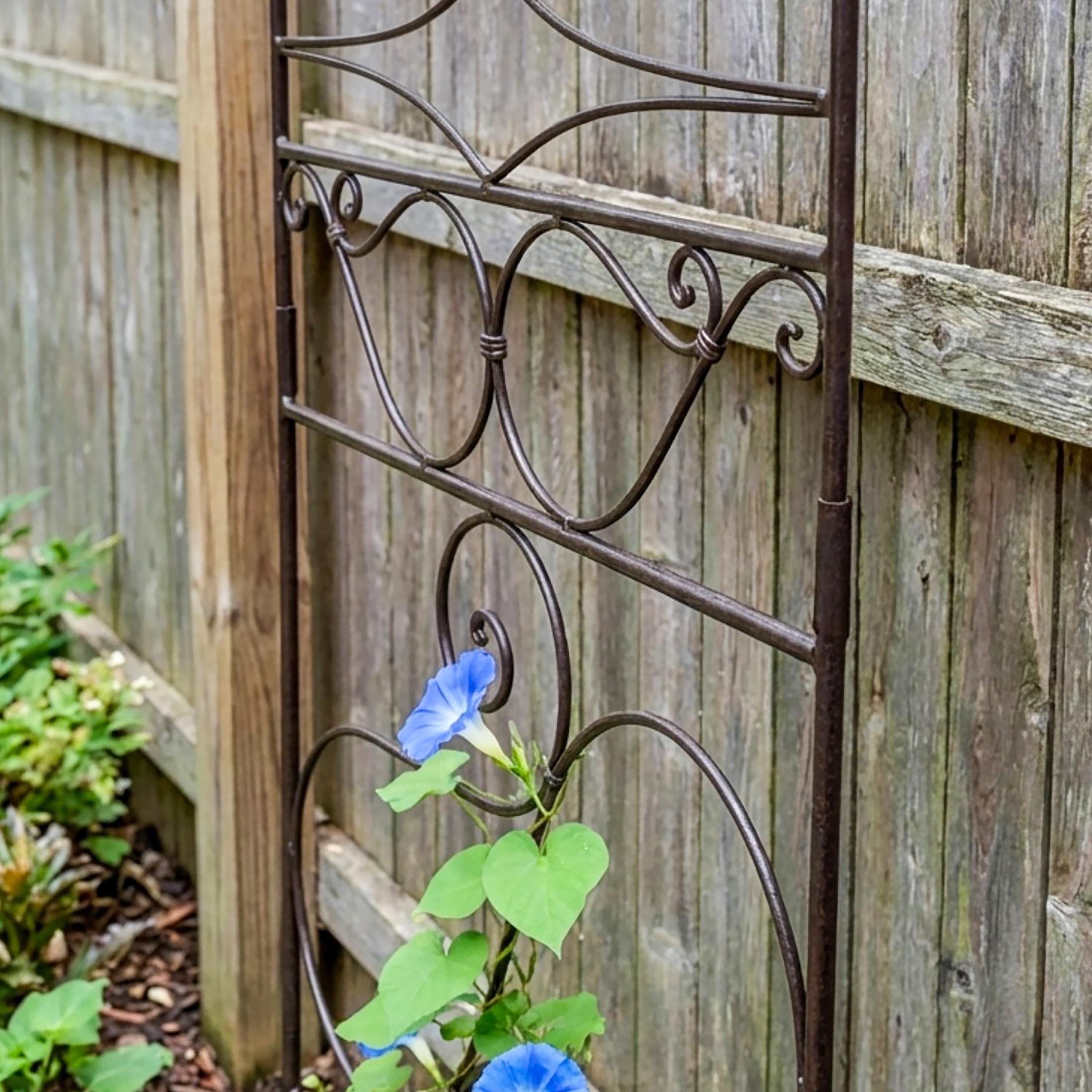 Light and airy in design, made of wrought iron, this trellis is ideal for supporting a compact climbing plant and lifting blooms above border plantings. Free-standing, the legs can be spiked directly into a garden bed or a large container, and six spiraling arms provide ample grasping area for plants to climb. Ideal for compact clematis varieties, thunbergia, or moonflower vines.