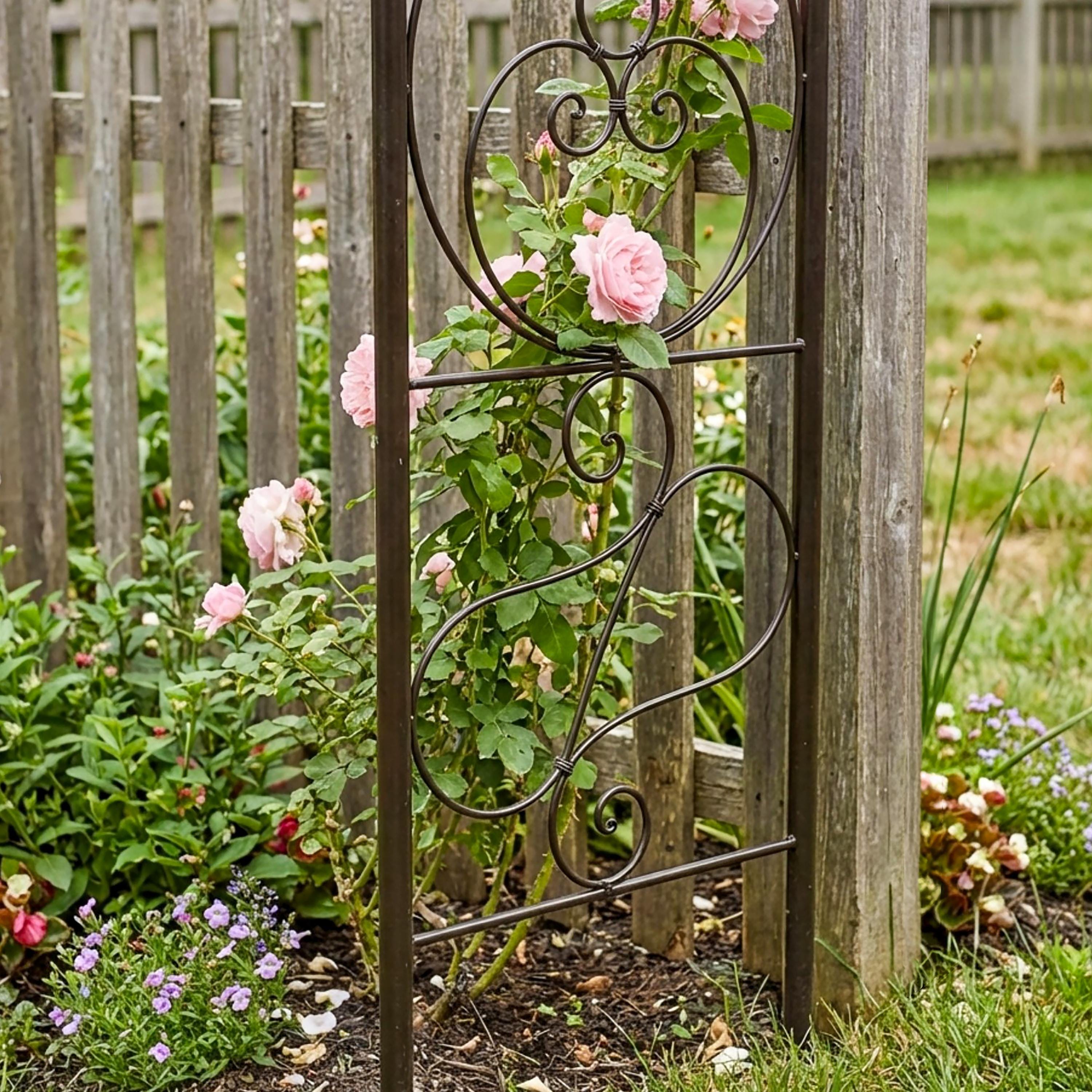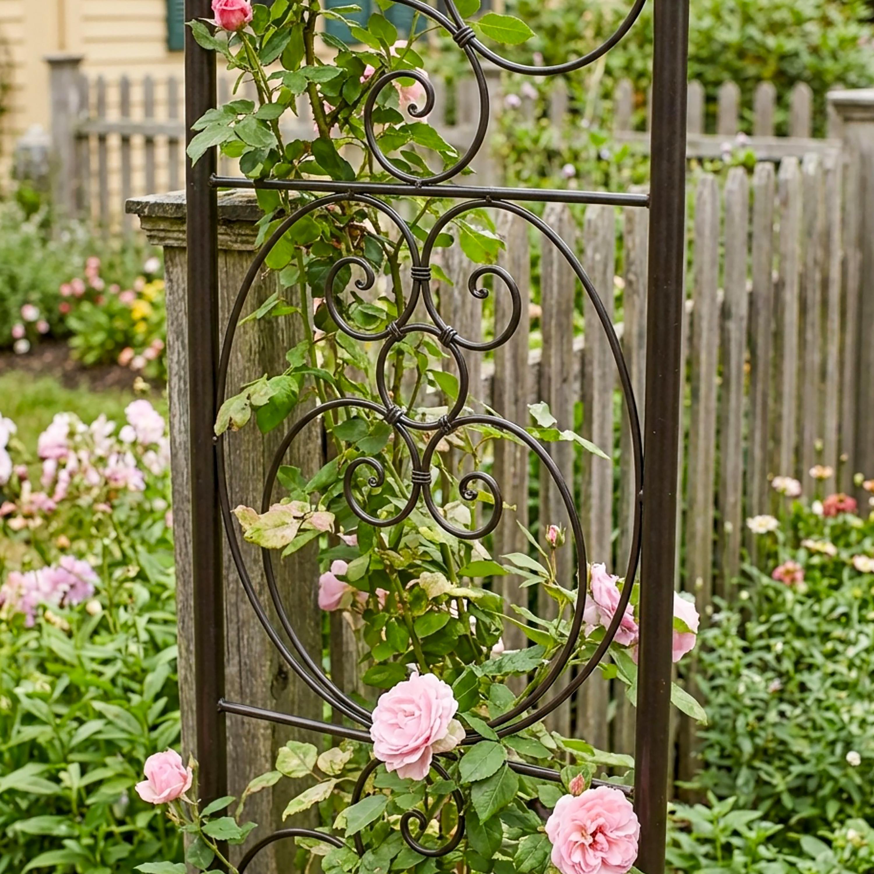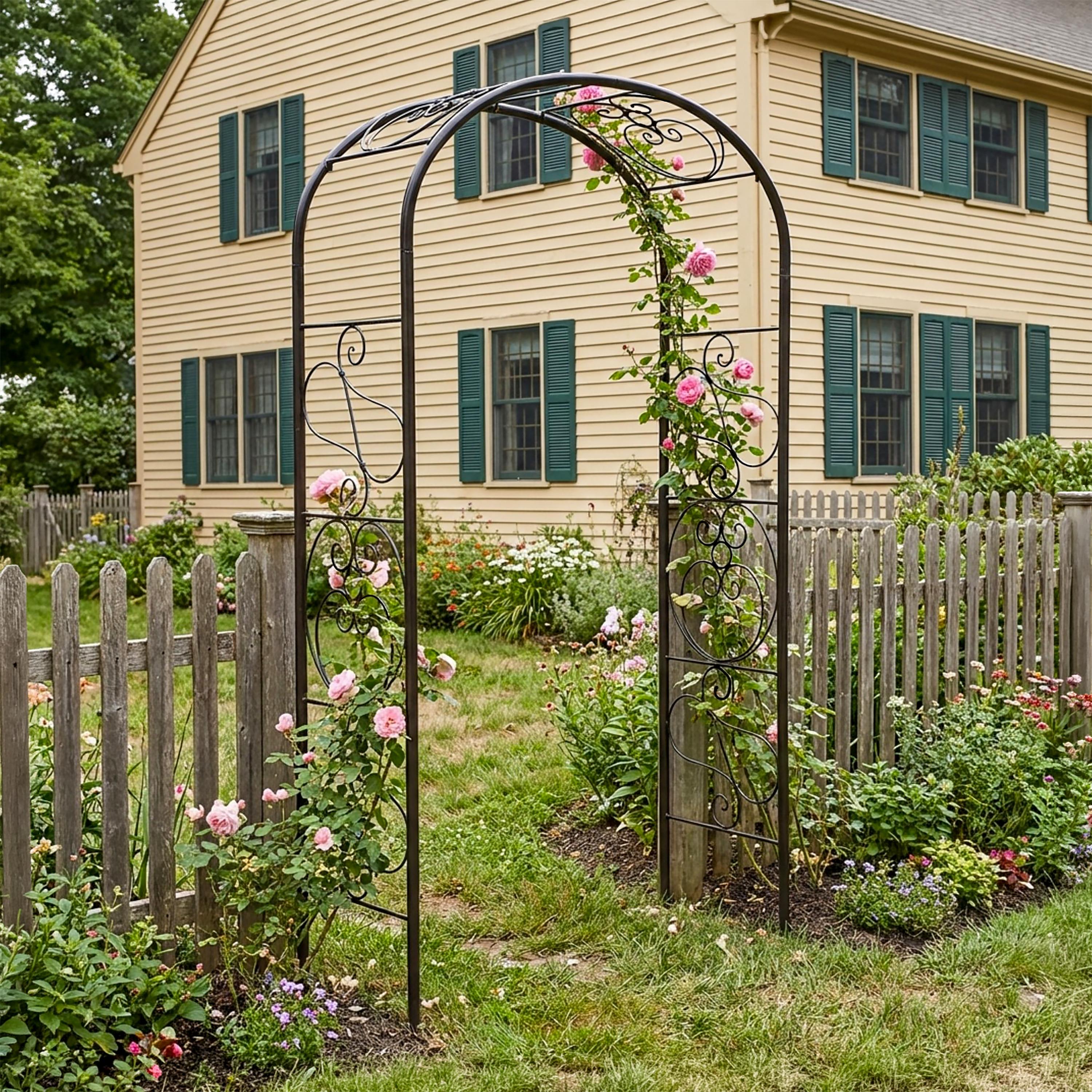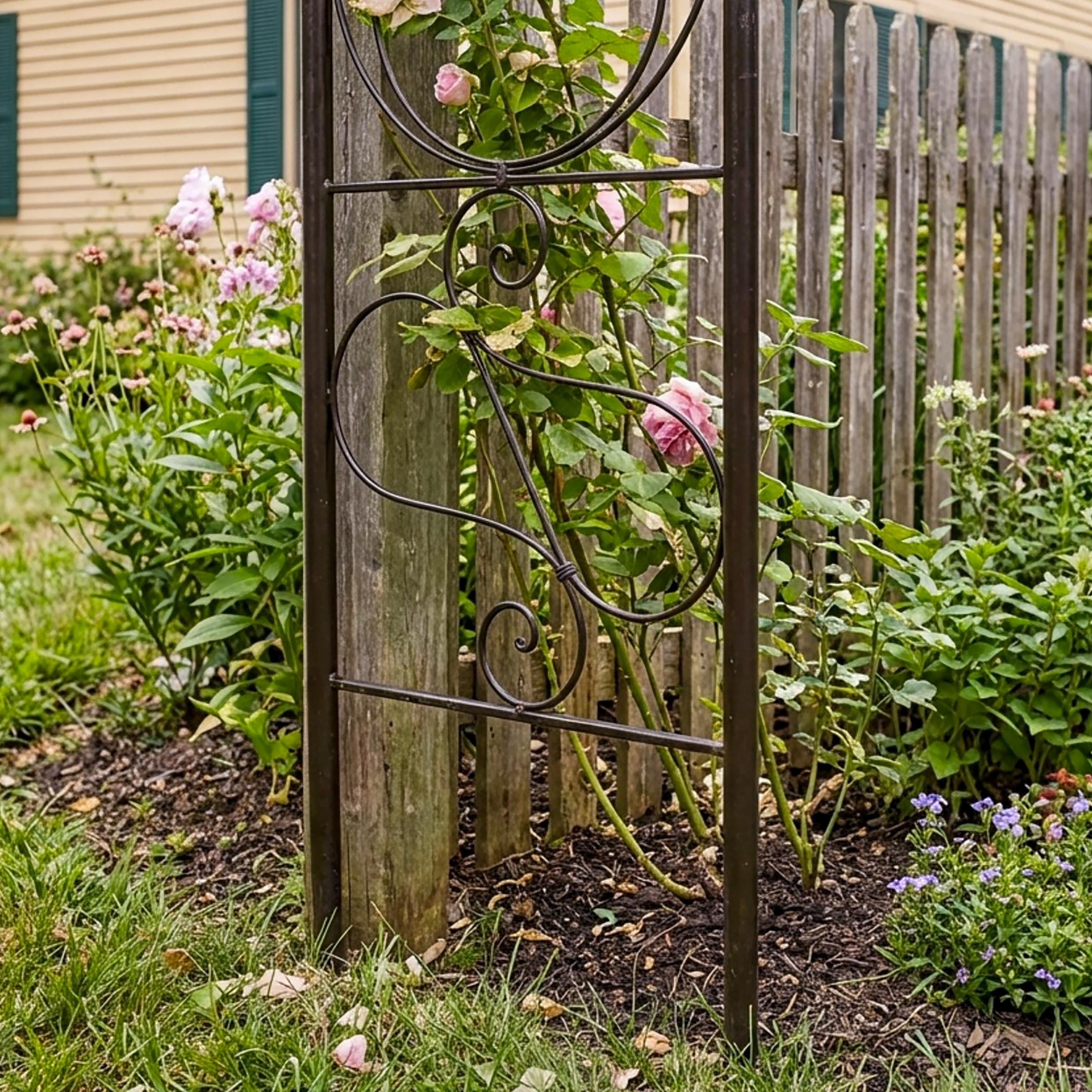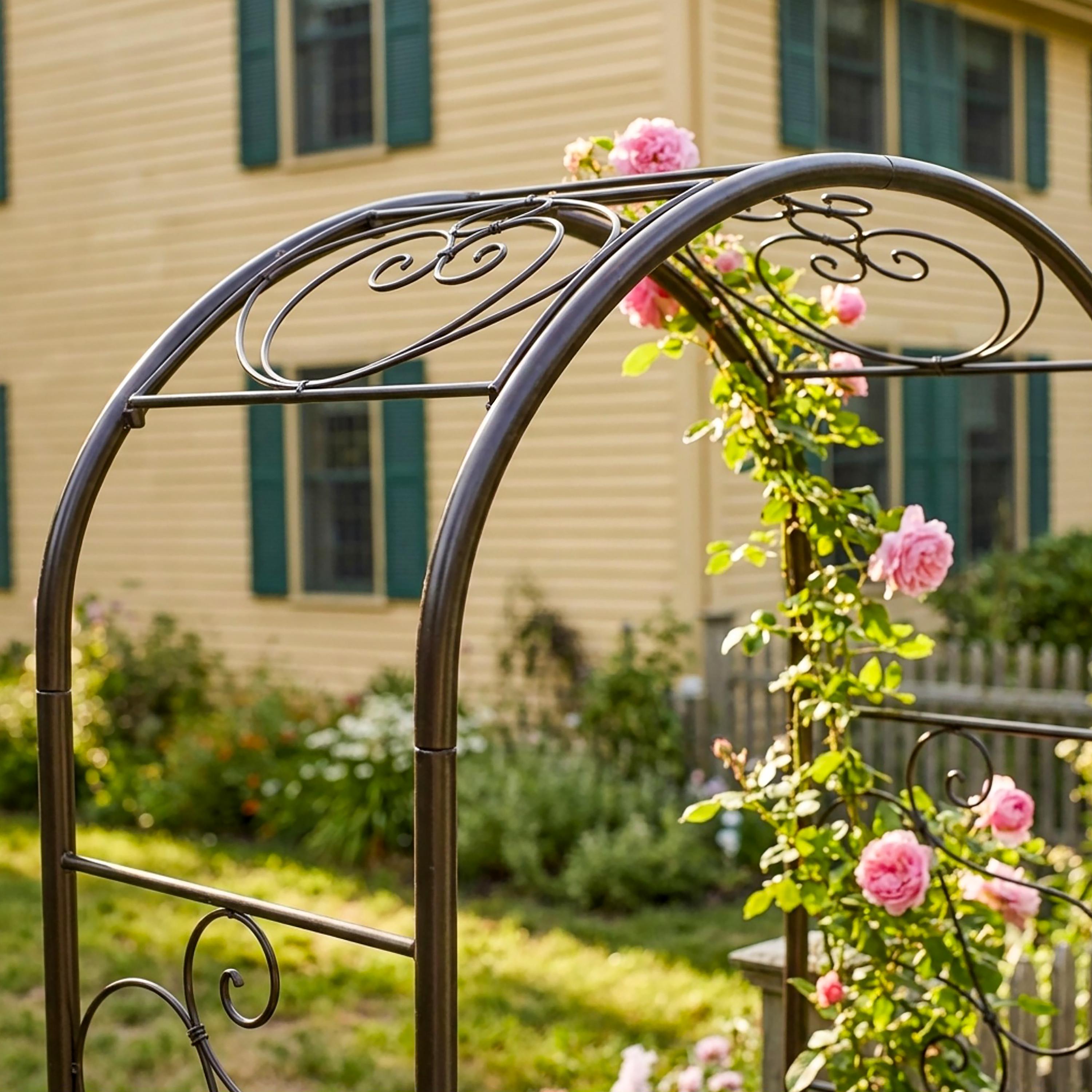 This sturdy wrought iron garden arbor makes a beautiful and welcoming entrance to the garden. This arch is tall and wide enough to grow an archway of blooming vines over a path with plenty of space to walk through. This light, airy gracefully design has the romantic old-world feeling of a vintage garden element. Easily assembled, this arbor stakes directly into a garden bed, and will support plants like perennial clematis or roses, or annual sweetpeas, for many years.