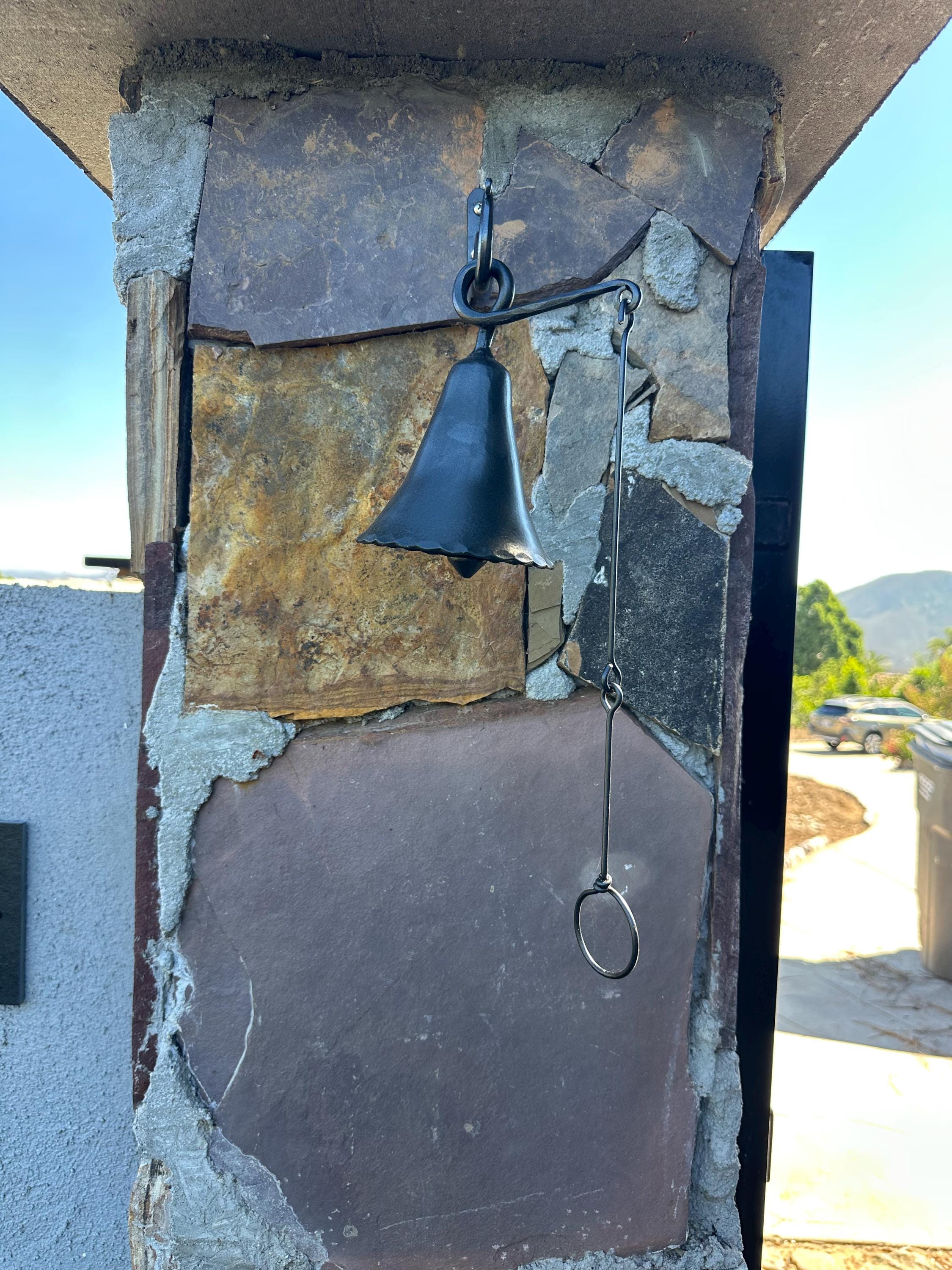 This is a hand-hammered wrought iron bell with a matching hanging hook. The bell has a pull chain that tips it to swing the knocker inside and ring a clear tone. The volume can be controlled somewhat by how much the chain is pulled. Designed for use outdoors, the bell and hook both have a graphite powder coating that retains the look of natural wrought iron but has some weather resistance. Call the dogs and kids home for dinner old-school style!