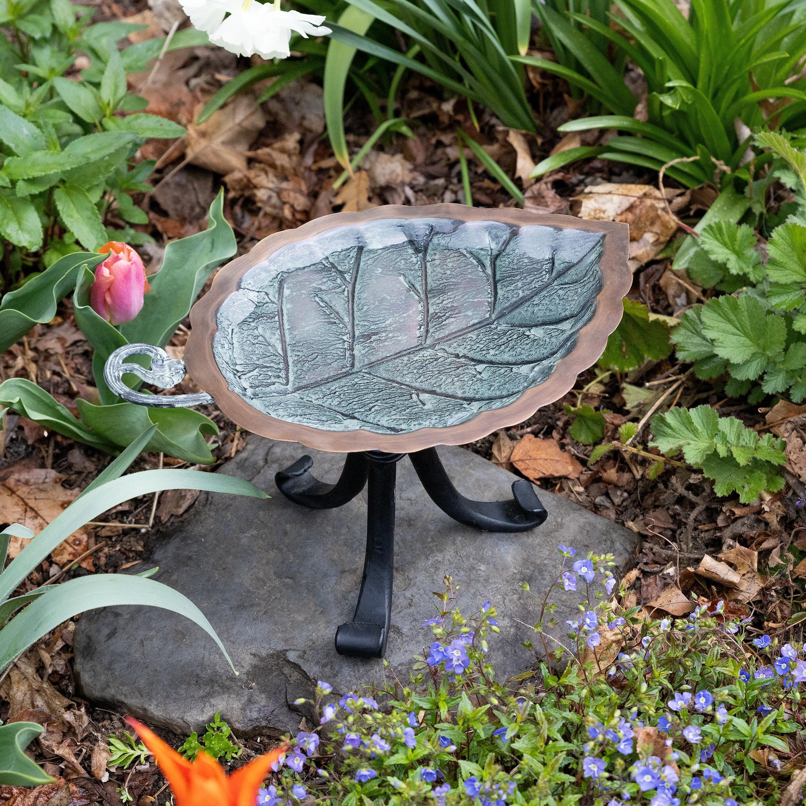 This is a leaf-shaped copper birdbath bowl with small tripod stand that is great as low birdbath, or garden centerpiece. The bowl has a verdigris patina finish on the interior, with a copper exterior. The narrow rim provides a landing space for birds to perch and drink or splash. The small three-footed wrought iron stand is perfect for rock gardens, tabletops, and low border plantings too.